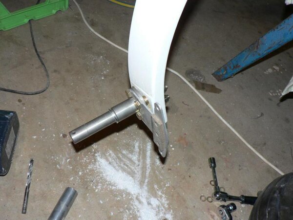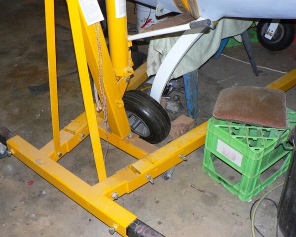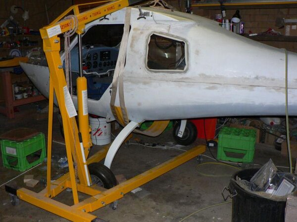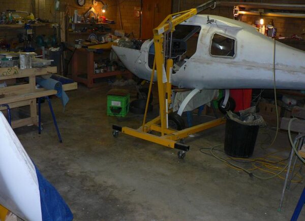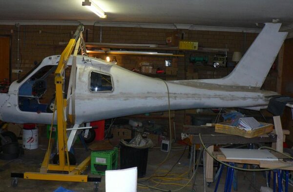 27-05-2008 Put up another short shelf in the corner behind the engine above the air compressor in its box. Cleared the main floor space at last so that the engine hoist could be manoeuvred over the cabin again. Note the front wheel is packed up a few cms so that the vertical stabiliser just clears the ceiling of the carport. Both main UC wheels are just clear of the floor. [ATTACH]5767.vB[/ATTACH][ATTACH]5768.vB[/ATTACH][ATTACH]5769.vB[/ATTACH] Tomorrow should be able to line inside the starboard tyre with foam rubber, change the axle and drill fibreglass leg for and fit larger bolts to axel and UC. I will wear my mask when I drill the leg this time!:confused: