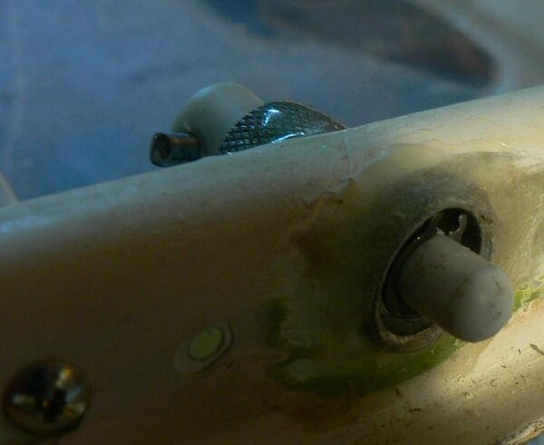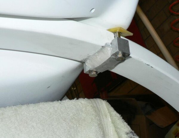 5-04-2008 This time I used 3 parts resin + 1 part hardner for making the epoxy mix. Removed the starboard main UC leg clamp and removed the resin from the clamp and the leg. After rubbing dry with a rag then used acetone to clean up both the clamp and the UC leg clamp area. Re-waxed the bolts to stop adhesion of epoxy. Applied epoxy with a brush to the clamp and the leg clamp area. Mixed flock with the epoxy to give a fairly stiff mixture so that it would not fall off the underside of the leg.. Applied a stiff thick bead of flock to the inside of the Aluminium clamp. Re-assembled the clamp to the UC leg and tightened up the clamp bolts. Made sure the clamp had a fillet of flock on each side from the underside of the clamp to the UC leg. Set up a fan heater to flow warm air onto the clamp area. Checked the clamp leg at about 10:30 pm after going out to see that the flock was cured hard - a few more days had been wasted, but getting closer! Ordered some AN6 matching washers from the USA.