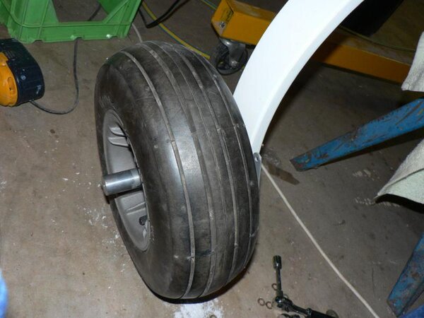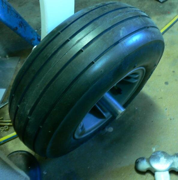 28-05-2008 Lifted the AC with the hoist and removed the starboard main UC wheel and stub axle. Removed the wheel from the stub axle and deflated the tube. Undid the bolts to split the wheel but the tyre did not want to let go of the rims despite the use of a couple of good tyre levers and a 6" vyce which would open just far enough to allow the tyre to be inserted and squeezed. Eventually got the tyre off the rims by lubricating the area with detergent and water on the inside and outside of the tyre. I think some detergent and water will be part of my tool kit as well as the tyre levers. Removed the tube. Lined the tyre with foam making sure it was long enough to need some compression to fit in the space making the two ends so that there will be no gap. Replaced the tube and partially inflated it to prevent pinching by the rims grabbing it during assembly. Applied talcum powder to tyre and tube to ease fitting of rims. [ATTACH]5771.vB[/ATTACH][ATTACH]5772.vB[/ATTACH] Refitted the split rims and bolted them together after taking care to align the valve teat and the bolt holes. Enlarged the 1/4" holes in the brake pad mounting plate to 5/16" to suit the new axle bolts. Fitted the new stub axle after drilling out the bolt holes in the UC legs to 11/32" and bolted it up with NA5 bolts and washers to an approximate good wheel alignment as done previously. Only need one spanner to do up bolts on the new stub axle because the bolt heads are stopped from rotating by the axle. [ATTACH]5773.vB[/ATTACH][ATTACH]5774.vB[/ATTACH][ATTACH]5775.vB[/ATTACH][ATTACH]5776.vB[/ATTACH][ATTACH]5777.vB[/ATTACH] Will need to check the wheel alignment again after the plane is loaded with wings and fuel. Washers could be replaced with flock filling or fibreglass packing depending on the size of packing required. Fitted the wheel back on the axle with the keeper on the outer end of the axle. Let A/C down off hoist and tried moving it - moved about 12" easily on wheels - so far! No sign of any conveyor belt under the A/C.