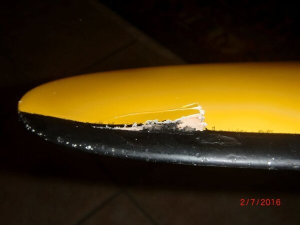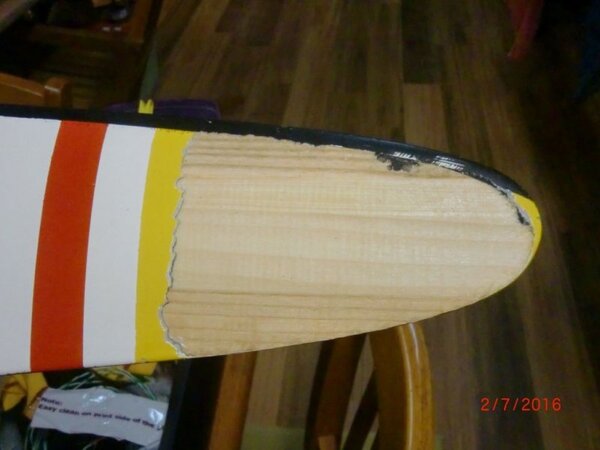I have a 2-blade fixed-pitch wooden GT propeller (from my Tecnam P92) where the fibreglass sheeting on one tip has delaminated. I had a slight vibration and some funny noise, when I checked back on the ground the glass/paint had lifted just behind the leading edge protection. Pulling on it, a 12cm section pulled off easily, see attached photos.