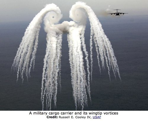 Greetings from a sunny South Africa! As a new member I had to share one of my favorite pictures, which relates to this very relevant topic! Wingtip vortices! Often spoken about, but seldom seen . . . . . this visualisation courtesy of a US military cargo aircraft having deployed missile countermeasure flares. What wingtip vortices are and how they form is relatively simple to understand: The air on top of the wings of an aircraft in flight is at a lower pressure than the surrounding air. This is one of the basics of aerodynamics - Bernoulli's Principle The air underneath the wings of an aircraft in flight has a higher pressure than the air above the wings This differential air pressure causes the air below to want to take up the area where the reduced air pressure is located above the wings The wing tips are really the only place along the wings where this can occur. So, the air below circles around the tip of the wing to meet the air above This circling action creates horizontal 'tornadoes' that trail behind the aircraft as the aircraft moves forward The air being pushed to the side of the aircraft's fuselage also contributes to the movement of the vortices. They tend to move away from the aircraft and then they follow the wind direction Operational Tips For Light Aircraft – How to Avoid Vortex Wake: 1. Lift Off Short of Large Aircraft Rotation Point. 2. Land Well Beyond Large Aircraft Touchdown Point. 3. Pass Over Flight Path of Large Aircraft, or At Least 1000' Under. 4. Stay to Windward of Large Aircraft Flight Paths. 5. Keep Alert, Especially on Calm Days When Vortices Persist Longest. (http://www.komanetskyaviation.com/Education/WingTipVortices/index.htm) Safe Flying!