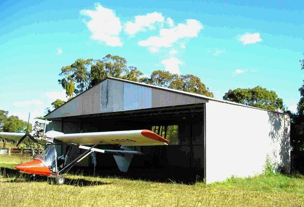 For anyone intertested, the hanger is 10m opening, 7m deep and 2.7 clearance with an open front. It uses 10m long commercial timber trusses for the roof supported on steel RHS poles. The covering is corrugated second hand Colorbond (donated) The cost, without the iron was under $2,000. This is a very cheap and easy way to get a hanger. At the moment the floor is dirt but I may put down a floor of crusher dust mixed with some raked in cement powder. This is lightly watered and then wacked down with a plate wacker. I have put tie down points in the floor for the plane.