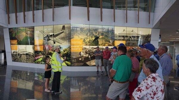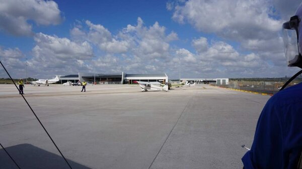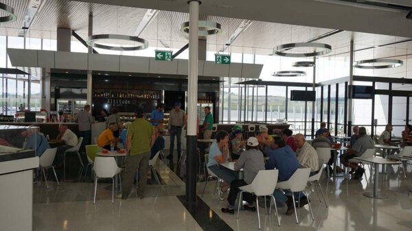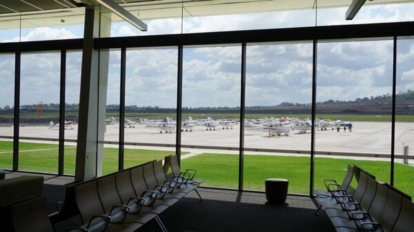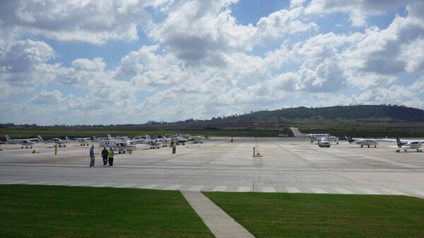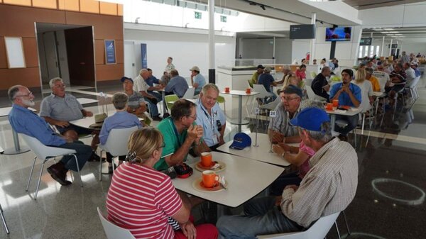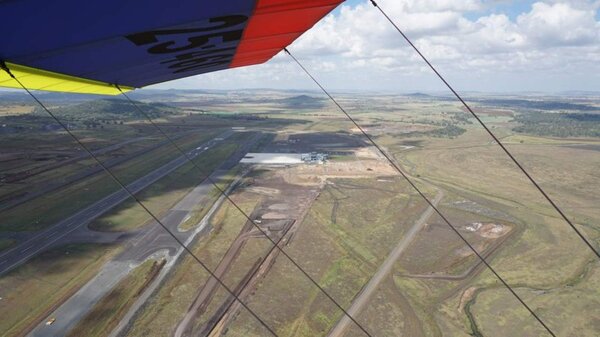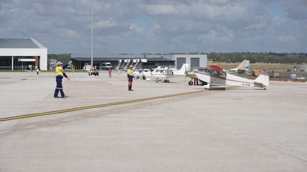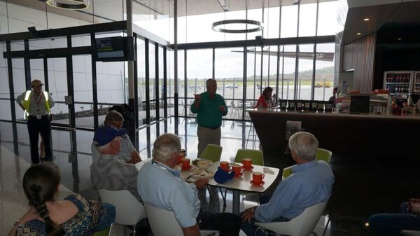 A opportunity to flyin into Wellcamp airport near Toowoomba became a reality this morning after Trevor Bange organized permission to allow Darling Downs Sport Aircraft Assn. members and Darling Downs Aero Club members to visit Wellcamp without the need to hold an ASIC's card. It turned out to be a near perfect day once the the patchy early fog lifted. A club meeting was to happen at 8am followed by a briefing on flying into and out of Wellcamp. Departure from Clifton was from 9am with arrivals at Wellcamp from 9:30am. Low performance aircraft were to leave first cruising not above 2500ft, medium performance at 3000ft and high performance at 3500ft. It didn't quite happen that way due to the lifting fog/cloud base only managing to get to around 3000ft at the time of departure. We were asked to fly via Wyreema and give an inbound call (8nm) and do a slight left hand turn to join a long downwind for runway 12 right base. As taxiway Kilo & Lima were the only operational taxiways we all landed long to minimize time on the very big runway! Someone counted 34 aircraft on the apron, all arrived in the space of half an hour with no issues. I was to share a club Drifter with Ben, he took the front seat going into Wellcamp and I flew it back to Clifton. Turned out that we were both looking forward to a back seat ride as both of us had never been in the rear seat before! On short final to the wide Wellcamp runway I was prompting Ben to continue the descent and not flare to high due the the optical illusion. His landing was smooth but he had to do a bit of dancing on the pedals to keep her straight during a fast taxi to taxiway Kilo. All pilots and passengers were then escorted inside the terminal where we enjoyed a some drinks and snacks from the coffee shop! I am sure they would love to have us flyin everyday. Sara, from Wellcamp airport pubic relations gave us a tour and John Wagner was there to greet us and answer any questions. He made it quite clear that we could fly into Wellcamp at anytime as it is a public airport. The only catches are, it will cost you and you will need an ASIC card! Around 11am we all headed back to our aircraft and most of us returned to Clifton for the lunch time BBQ. We were greeted with a light breeze on return to the Clifton circuit. A great day was had by all. I only needed to drive back home to Oakey which is an hour's drive from Clifton........and 12 minutes drive PAST Wellcamp airport! Cheers, Wayne. Here are some photos.
