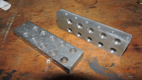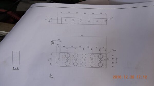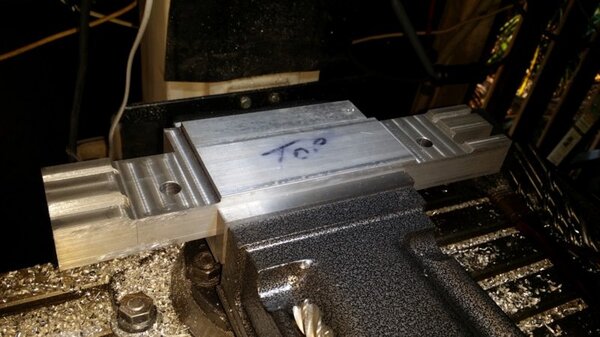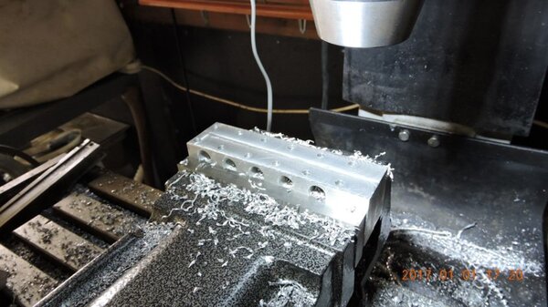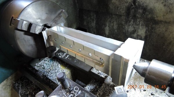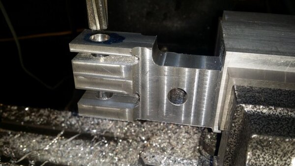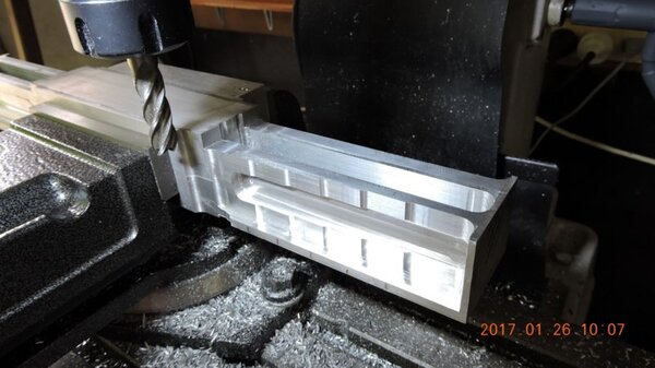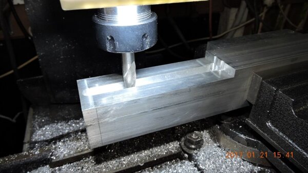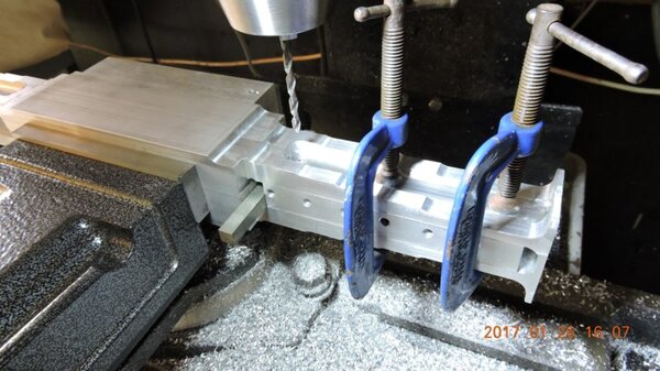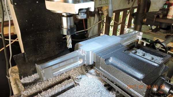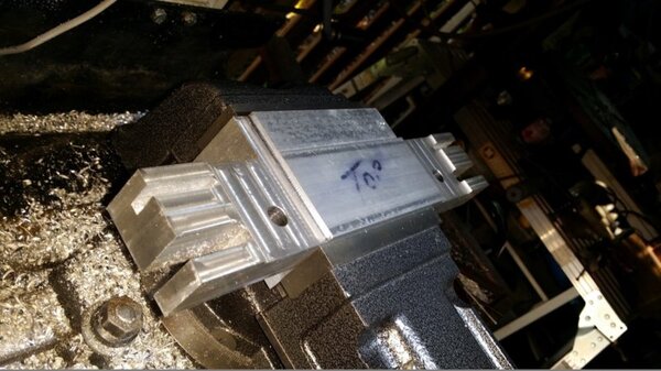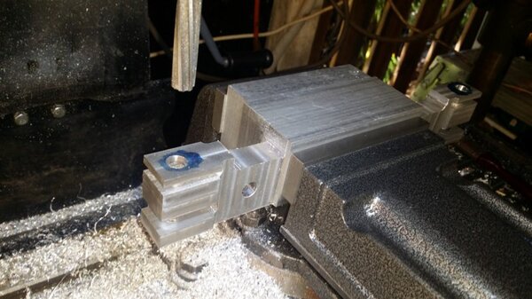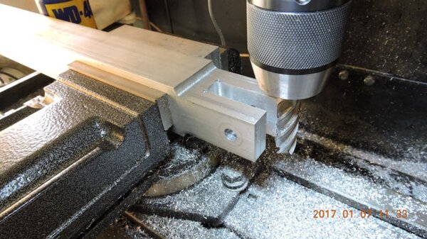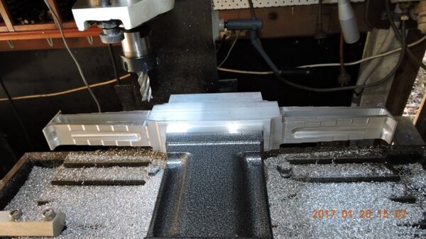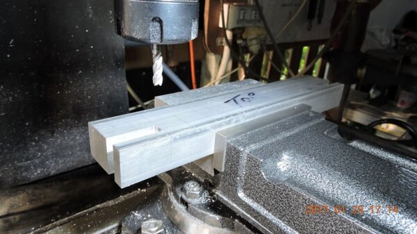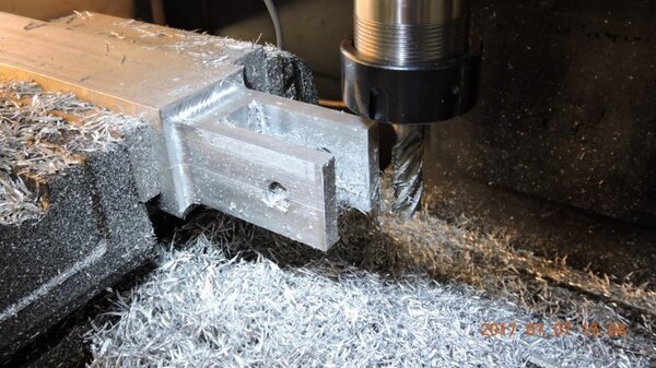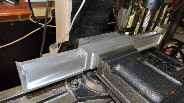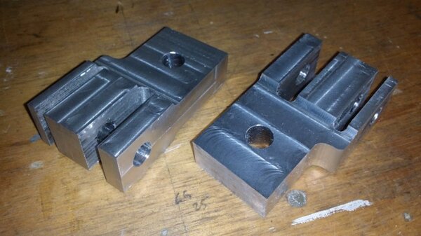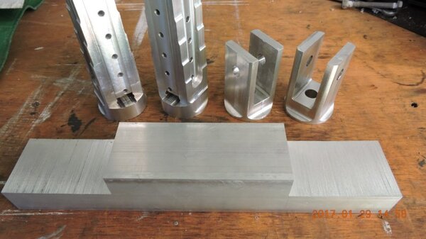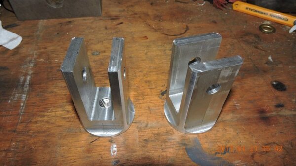 A few months back, when I was going through the strut calculations, forumite Oscar mentioned to me that he knew of a pair of aly struts that might be available and might be a suitable size for DooMaw. I had a bit of difficulty getting information from the owner of them as he was very busy, and I gave up because I was quite set on having chromoly ones in any case. In November I was finalising the design of the strut ends and it became apparent that aly struts would suit better because aly struts end up with inserts bolted into the ends of them whereas chromoly struts have a cut-out with a welded perimeter which becomes a pair of vertical straps to attach to, at least those are the most 'conventional' methods, and which probably are the best strength-to-weight solutions. Since DooMaw's wing-folding mechanism at the strut ends requires something solid (as in a solid block), rather than a couple of plates to bolt to, then the aly struts started to look a lot more appealing than previously. Consequently I renewed my pursuit of them and following a few weeks of persistence I was very well rewarded when a brand new pair of extrusions arrived for the princely sum of just $350 including the freight. Thanks heaps for the tip-off Oscar, it saved me heaps in time, hassle and money compared to having to get them in from USA - and Trump's now withdrawn USA from the TPP so I guess he doesn't want any more of our money, does he? Then it was time to concentrate on machining the strut end parts because once I get them out of the way most of the rest of the build is fairly straightforward - there's still lots of it to do, but most of the complex work which takes up so much time with little to show for it, will be done. I modelled the parts in CAD first and produced the drawings, though I knew there would need to be a little refinement along the way as machining difficulties revealed themselves. To feel that I'd made a start I began with a couple of parts that will be bolted into the upper ends of the struts, and the machining just involved an accurate drilling setout. It's just made from some 16mm 5083 plate. Two are made at the same time in one piece and then sawed down the middle and milled square and to size - A simple job like that was one thing but it's been years since I did much complex machining requiring careful attention to machining order. In which case I thought it would be prudent to get my head back in shape with a fairly easy part next, and I'm glad I did because, although apparently simple enough, it still threw a few challenges at me. I should say 'pair of parts' because it's much quicker to make two at a time, one on each end of a piece mounted through the vise, than to do one and then another the same, because you can use the same setup for each machining process, just move the table back and forth between each end. One of the things that always tests me with these kinds of parts is how to get hold of them during the latter stages, to complete the final machining once I've cut off the main boss that clamped in the vise at first. Another thing with any clevis type of part is that you're effectively making a tuning fork so it want's to sing like Dame Nellie and so it is very prone to chatter and running out dimensionally. These parts do show more than a little evidence of that but I'm not concerned from a structural viewpoint because the parts are designed to withstand the dynamic loads of supporting the wings while trailering on rough roads, which are much higher than the flight loads would ever be, and they can't actually deform during trailering because the travel will be limited by fuselage/wing support cradles in the trailer. So the only matter to really take account of is the bearing surface areas of the swivel and hinge pins which I've made very substantial, and the holes are carefully reamed to exact size, rather than just drilled - the accurate fit of the hinge pin massively reduces the rate of wear in service. A few pics show the first effort, the ends haven't been radiused yet, I'll do that when I've finished all the linear machining and can remove the vise from the mill and mount a small rotary table - In the last picture you can see a tapped thread, I made that so that I could screw in a mandrel to mount the part in the lathe and machine the boss end circular instead of square, the thread will be drilled/reamed out in due course. Having broken the ice I was keen to get on with the most complex of the parts because once they're done it'll feel like more of a downhill run. These present quite a challenge because they're very long tuning forks with lots of machining along the length of the tangs, and also because later I have to mount the parts up in the lathe to machine them circular, similar to the last parts, but this time they're much longer and achieving concentricity is going to be much harder. I had worked out a method to stop the tangs harmonising though, and that would be by leaving a full web all down one side and also a web across the end. The end web would also help with the concentricity thing in the lathe because I could drill though it centrally to provide an end support for the mandrel, and additionally run a live centre in the boss end. The long web down the side would add a significant complication though, because I would have to mill a very deep trench from one side rather than half the depth from each side but that would just be a matter of taking my time and being careful. The end web posed a hazard, because the machining travel would have to be terminated accurately at both ends, rather than just one. It's so much easier if you only have to concentrate at one end and can relax as the cut runs out the other end - that's the beauty of CNC machines of course, taking the long periods of concentration out of it - because with manual machining, one stuff up late in the job can cost you days of doing it all over again from the beginning. The pictures below show whe