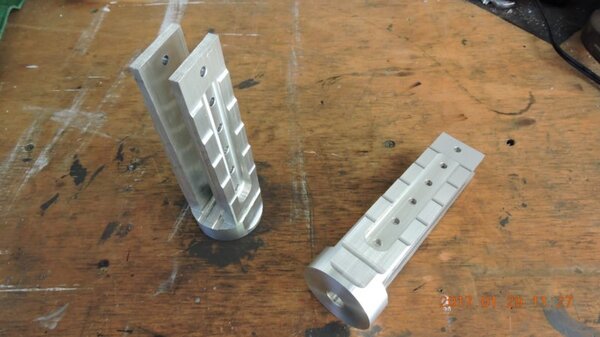 Another weekend a bit like the preceding ones - machining, machining, with a lot of sweat to go with it, we're into the third consecutive heat-wave now. However - sheer bliss, I completed the trickiest pair of parts, the long clevises, without stuffing them up and having to start again. I'm a lot less concerned about messing the rest of them up because if I do, by comparison they're a minor task to repeat. So, as the pictures show, I completed all the milling processes then cut the two parts away from the central billet which I'd used to hold them in the vise. Then I created a setup to hold each of the parts in turn in the vise and drill centrally through the end web. I made up a long centre-drill by boring the end of a piece of ground stainless shafting in the lathe and silver-soldering a centre drill into it. I then used that extended drill through the hole in the end web to start the hole in the butt end of the part. By carefully scribing the position of the centre on the inside of the butt end, and finely adjusting the part in the vise, when the centre-drill met the scribed position I could be sure that the part was exactly vertical. Then I used a progression of long-series drill bits to increase the bottom hole up to 13/32" and the top hole to 12mm at which time I could tap a 12mm thread in the butt end and use a 200mm long cut-off 12mm bolt as a mandrel to mount the part in the lathe. Beforehand I had used a centre drill in the threaded end of the mandrel so that I could employ a live centre mounted in the tailstock to support the end of the workpiece, and then it was just a few minutes of machining to turn the butt end circular so that it matches the first pieces I made. After the turning was completed I no longer needed the webs on the end of the parts so I cut them off in the bandsaw. Those square-cut ends will be radiused later, when I have finished with the parallel vise on the mill and can remove it to mount the rotary table. Finally I drilled out the threads in all four parts with which I had used the threaded mandrels, to 1/2", ready for the sleeve which goes through them, and about which the wings rotate as they're folded. Moving onto the next parts, I didn't need the billet to be the full thickness and was able to make use of the newly refurbished upright bandsaw to cut away the excess as shown in the second last photo. It took just three minutes a side to cut that, whereas to create the setups and mill that amount of material away would have been more like an hour, so it's really nice to have the big saw working again. I got as far as milling a full depth slot each end before the sunset, these will be the clevises that attach directly to the cleats on the wing-spar. Another 17hrs in that lot, and I forgot to add to the total last post, so it's 26 more hours, making a total of 1406hrs to date. Many thanks for the kind words srPilot but it's nothing remarkable really. It just comes from having a tight budget and the scavenging resourcefulness that results from being born and bred in the bush where there's plenty of opportunity but often there's not a lot of equipment unless you make or fix it yourself. rgmwa and Oscar are so right, it's FLAMIN' LUXURY to have old broken tools to fix up and work with, you tell that to the kids of today ... Just in case you're not a Monty Python fan, this is what they're on about - -