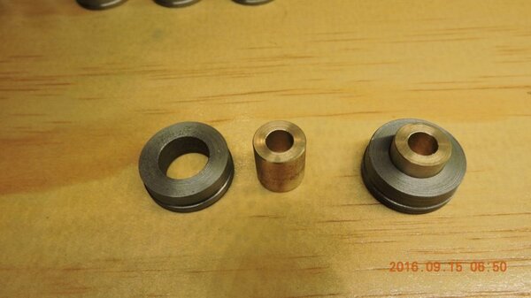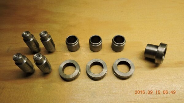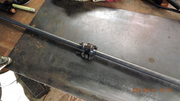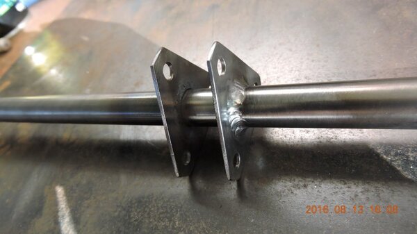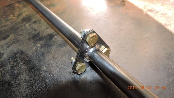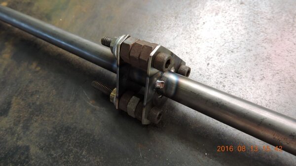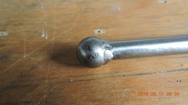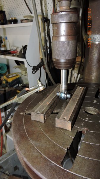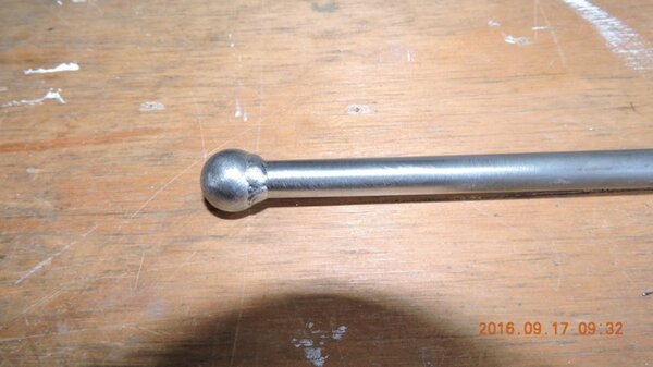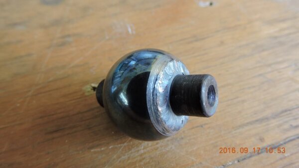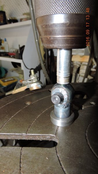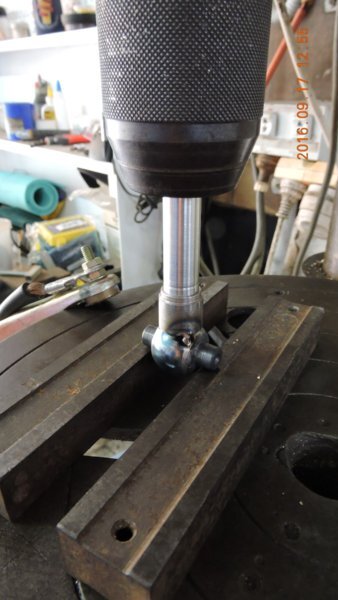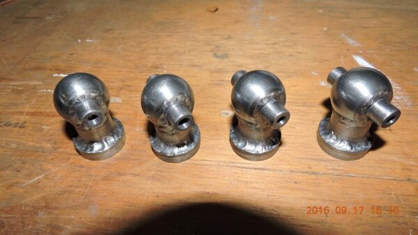 September 17th 2016 - Yesterday was a good day. As I mentioned earlier the auto-connect/disconnect system for the ailerons and flaps when the wings are folded and unfolded was the last matter still playing on my mind, until last week. In the previous post I described the 'Dogbone Method' and the machining of the parts for it last weekend. The last remaining minor concerns I had were the effect welding would have on the metallurgy of the steel that ball bearings are made from, and whether I would be able to make good enough welds on such small components, while also keeping the parts perfectly aligned so that the assembled items ended up within close tolerances. The crossbars needed to be quite perfectly square to the shaft. To satisfy myself about the issue of welding 4130 CRMO tube to the ball-bearing I decided to make a test piece first. Previously I mentioned that I would anneal the drilled balls prior to welding them but having given it further thought there would be little point as they would reach cherry red during the welding, so it would be the rate of cooling that would affect the hardness and temper of the completed part. The concern I had was that the balls and the CRMO are both high carbon steels and if they cooled too quickly, and with the (probably) fairly high chromium content in the steel the balls are made from, the welded joint could exhibit brittleness because 4130 doesn't like to be welded to high chromium content steels, especially stainless steel. The degree of brittleness I'd end up with was a complete unknown, though I had already determined that these balls are not stainless. So - among my 'things' I found a ball-bearing, not as large as the ones to be used for the dogbones, but large enough for the purpose, and I welded it to a piece of 3/8" CRMO tubing. I was careful to allow it to cool in still air. The steel the ball was made from was quite different to weld from welding CRMO, it welded more like mild steel, but didn't show any noticeable reluctance to meld in the puddle. Once it had cooled I put on a face shield in case it shattered under the crude test methods I had in mind, and used the part like a club to bash a large steel block I use as an anvil. I was actually very surprised that it didn't do anything untoward at all, I did quite expect the weld to break, or the 3/8 tubing to break at the HAZ (heat affected zone on the outer edge of the weld). I welded on an extension to the length of the tubing and gave it some more big swings, as you would with a golf club and the stupid little white ball ... and it still didn't break. Next I put the ball in the vise and whacked the tube with a hammer, and then the other way around with the tube in the vise and whacked the ball. In that last test I could have broken the tube if I hit it hard enough of course, but I wasn't trying to test the tube, just the weld. Examining the ball I could see that the impacts between the ball and steel block had been hard enough to cause quite large indentations in the ball. So the force was quite high which in my mind gave the test reasonable validity, certainly enough for me to be confident that the ball-to-4130 weld is many times stronger than it will ever experience in service as a coupling. After all, it only has to be stronger than the weakest component in the system, which is the 7/8" x 0.049" wall 6061T6 aly tubing that the torque-tubes are made from. Having done that I decided to make another test, just as a matter of interest. I reheated the welded ball and tube to cherry red with a blowtorch, and dropped it in a bucket of water. That would have shock-cooled it and left the metals in their hardest possible state, and without tempering them afterwards they would also be at their most brittle, theoretically ready to shatter with little more than a firm clout of a hammer. Then I adopted the face shield again and swung it against the 'anvil' again, put it in the vise and belted it and so on, and it still held up. That rather makes you wonder about all the brouhaha about making sure there isn't even a zephyr of breeze in the shop while welding the airframe, perhaps that's meant for folk who are welding up an airframe in the Alaskan winter, rather than those of us who've sweltered through our tropical summers making one. Anyway, thus emboldened I set to work to weld the cross-pins into the balls. The first one took a fair bit of concentration but they got easier after that, especially once I made a little set-up to hold them still on the bench. The second stage of the process required a jig of some kind to hold the balls and the stem so that the stem would be exactly at right angles to the cross-pins. Even though it's only a Taiwanese cheapy, my pillar drill has a table that is adjustable in all axes and the vertical motion of the lockable quill was the obvious way to clamp it all together. In the lathe I made a small mandrel from some aly rod to fit one end into the chuck and the other end slip into the stem. Using a small engineer's square I adjusted the table to make sure it was perfectly at right angles to the quill, then sat the cross-pins on a pair of parallel blocks and used the quill to clamp the stem down onto the ball. I then put four small tack welds around the contact points and did the same for the other three balls. Then it was just a case of going back to the bench and completing the welding. Finally I had to attach the flange to the other end of the stem and since I had machined a close-tolerance spigot on that end it was just a case of using the pillar drill and the centre-drill indent in the end of the mandrel to clamp the ball-and-stem firmly down onto the flange and tack it in four places around the perimeter, similar to the other end - then back to the bench to weld those out too. Pictures - Test piece - the second close-up pic shows the indents in the ball after the testing Welding the cross-pins in Setting the table square to the quill using an engineer's sq