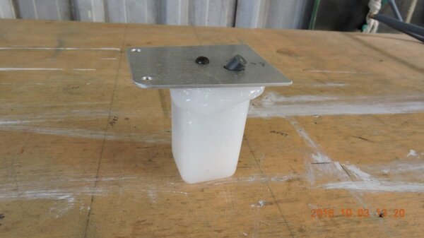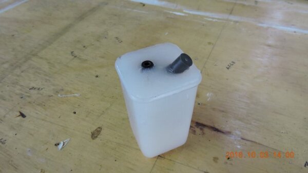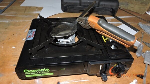 October 3rd 2016. Yesterday I made the mass balance for the trim tab. I balanced the control surface on its hinge line and added test weights to find out how much weight was required, then added a nominal 10% to account for the weight of the fabric covering. Once I knew the required weight I worked out what volume it would be and made up a torpedo shaped template so that I could picture the size and shape that the weight would be. It isn't critical that the weight be exact, within 10% or so is quite close enough, so I then turned a free-hand shape out of acetal on the lathe and cleaned it up with a single-cut file to remove small imperfections and give it a good finish. I drilled and tapped the narrow end so that I could use a 3/16 machine screw to hold it in place while making the mold. Next I turned up a tapered piece of PVC, this would be used to form a gallery into the mold to pour the lead into the cavity. I mounted the acetal and PVC parts to a piece of 2mm aly sheet and then went in search of a suitable container to make the mold in. Those small disposable plastic cups that are used to hold water from a water chiller would have been ideal but I didn't have any so I found a small 'tupperware' which was the right size. I forgot to mention, I was making the mold from silicone, as it's so quick and convenient for one-off molding of lead. Provided you don't overheat the lead, silicone easily manages the heat of molten lead. Lead melts at 330°C and most documentation has silicone melting at around 300°C but it copes with higher temperatures for short periods, so if the lead is 'just melted' and then poured quite quickly so that it doesn't freeze up during the pour it works fine. One caution though, the relatively high temperature does cause the silicone to give off some vapour which affects the surface finish of the lead, so if you want fine moldings it's not the best way to go. If you wanted a better surface finish you'd need to go down the Plaster of Paris road which is rather more arduous because you can't pull the mold off the positive to leave an empty cavity so you have to make an indexed split mold or use the lost wax process, and make sure you bake the plaster mold in a low temperature oven for a few hours to dry it completely before pouring the lead or the heat from the lead will boil any moisture in the plaster and the steam will eject the lead violently and/or explode the mold, either way probably spraying you with liquid lead and causing horrific burns ... beware! I mixed up a quantity of platinum cure 2 part silicone, filled the plastic container and immersed the mounted plastic parts in the silicone. The silicone takes about half an hour to cure sufficiently to de-mold the plastic parts. Before mixing the silicone I had sprayed all the parts including the container with Ease Release mold releasing agent, so to get the mold out of the container I just had to put the nozzle of an airline between the side of the silicone and the container and blow it out. Once the silicone was no longer constrained by the container it was simple to just pull the plastic parts out of the elastic mold. I then created a set-up with the mass-balance support tube dangling into the hole in the top of the silicone mold, heated some lead in an old steel spoon using a gas ring below and a small blowtorch above, and poured the molten lead into the gallery created by the tapered PVC piece. Once the lead had cooled sufficiently I broke the lead sprue off at its narrowest point and pulled the silicone mold off the mass-balance. The last photo shows the control surface now balancing level. After that photo was taken I lightly dressed the surface of the lead with a fine rasp and it's ready for painting - Six hours of fiddling about, a total of 1303 hours so far. -