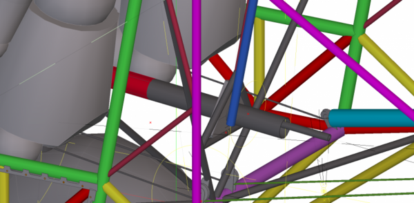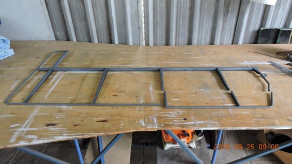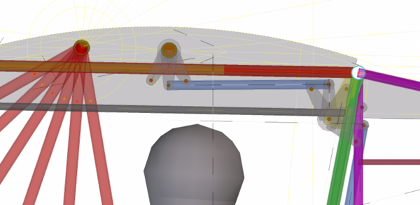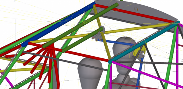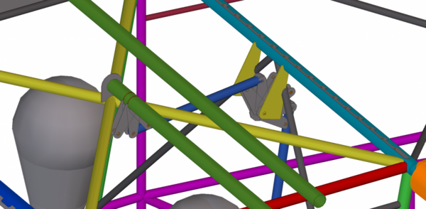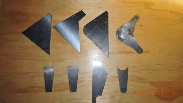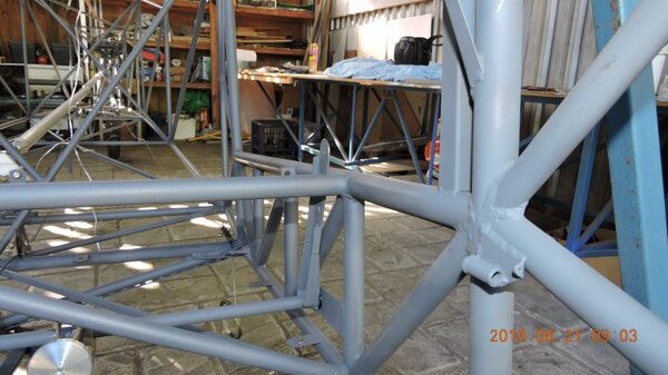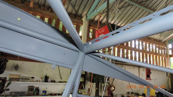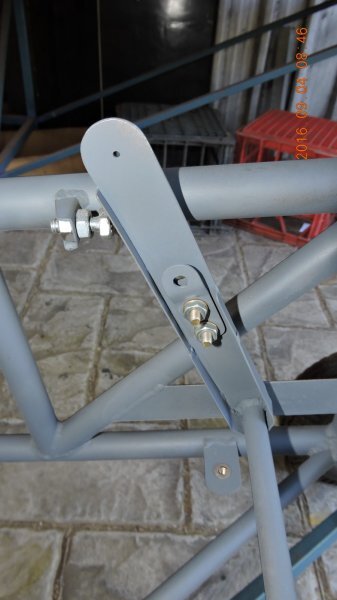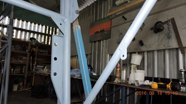 More log catch-up - between August 14th and Sept 2nd I was working on finishing off the list of remaining 'things to do' to complete the welding on the fuselage so that I can get the epoxy paint coat onto the frame and begin final assembly of all the parts. I wrote up the list in post #167 above, here it is again - Finish the tab plates Make and fit the throttle bar and supports Similar for the choke Make/fit hinges for the doors Make/fit latch plates for the doors Add cleats to secure the fuel tank(s) Fit the flanged cabin-top plates made previously to support the clear cabin roof Design/make/fit the cabin-top aileron control attachments Design/make/fit the flap control attachments ... and probably a few more things I haven't thought of yet. Some extra things I've thought of - plates to attach the gas struts to hold the doors open some tab plates with small holes in them, to be able to zip-tie wiring and cables so they don't flop around An attachment plate for a trim lever A plate to carry the headset sockets In my previous post I detailed making and fitting the throttle bar and choke cable bracket, then I went on and finished the last four tab plates which were two which hold the sides of the firewall and the two which hold the top of the windshield above the cabin. I then made the hinges for the doors and the baggage doors, they were larger versions of the control surface hinges i.e. small pieces of shaped key steel drilled off-centre in the lathe and welded in place. I decided against having plates for the door latches, instead the latch rods will locate onto mylar behind the door jambs which are already installed. I did install securing plates for the baggage door, at the front corners I added plates which will carry the spring for a Dzus fastener, and at the rear corners I drilled the harness bracket to carry a similar Dzus spring. The cleats to secure the fuel tank were added a while ago and described in post #168. Incidentally, DooMaw will have three fuel tanks, the main one forward of the instrument panel will hold approx 60 litres and will be fuelled via the lower starboard corner of the windshield, similar to a Wittman Tailwind, it's a good arrangement for a taildragger because it's the highest point of the tank. Having the filler through the windshield is one good reason to have a flat windshield if it's polycarbonate because being flat it's not under stress and so will not craze if (when) you inadvertently spill some fuel on it. The other two tanks will be wedge shaped, about 25 litres each, with one located each side of the elevator pushrod, under the baggage locker. They will straddle two of the lower fuselage cross-members and will be plumbed so they can be pumped up to the main tank as required. They'll also be easily removable so they can serve as portable jerrycans when fuel has to be obtained some distance from the landing ground. I had to go back to the CAD work for a while then, to design the aileron control linkages. I needed to transfer the lateral rotation of the control column's torque tube to create a longitudinal rotation of two aileron torque tubes above the centre of the cabin. I had to separate it into two torque tubes rotating in opposite directions to make the ailerons move opposite each other on each wing, of course. I also had to do that without having the pushrods where they would obstruct the baggage area or the occupants, and where they wouldn't be subject to accidental damage or fouling. To achieve that I would need two opposing pushrods running vertically close behind the seat frame to a pair of bellcranks at the top rear of the cabin. Those bellcranks to be supported by a pair of plates attached to the rear spar carry-through, and its associated bracing. From those bellcranks will be a pair of pushrods running forward along the cabin top, above and between the occupants' heads, which attach to control horns on the underside of a pair of opposing torque-tubes, one of which will operate each aileron. It was a tight fit to get it all in with enough angular motion available for the bellcranks and the control horns because in each case they run past/through bracing structure which limits the motion, thank goodness for CAD, it would be much more difficult without it. Here are a couple of CAD images which show the extent of the motions available. I'm getting 30 degrees each side of centre which is ideal to avoid too much Ackerman effect at this stage, instead it will be employed at the outboard actuation to achieve the differential between the ailerons' up and down travel angles. The blue pushrods operate the ailerons - I've only shown the port set, the starboard ones are a mirror image. The red is the flap handle, showing its range of motion, 0-60 degrees in 5 stages - Next I fitted the flanged sheetmetal each side of the cabin top at the wing junction, they carry the edges of the windshield over the top of the cabin, give support to the small tubes which carry the door and baggage door hinges, and also carry the bushings to support the centre sections of the aileron and flap torque-tubes. I then went on and marked out the positions of the centre of those torque-tubes and drilled a 1/4" hole through which I could thread a 1/4" rod to hold the aileron torque-tubes' centre support in place (above the centre of the cabin top) while I tacked it in place. That process ensured everything was in perfect alignment, which it needs to be if the controls are to work smoothly and also connect and disconnect automatically when the wings are folded and unfolded. I ordered the door gas struts online. The last ones I ordered, which were a similar size (300mm long when extended) to support a large toolbox lid, were over $100 each about 20yrs ago and lasted about six months. They're amazingly cheap these days, $23 for the pair, delivered by courier the next day, and with a 2yr warranty. Once I had them in hand I could estimate a range where they'll be fitted, so I made p