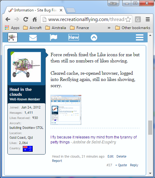 Force refresh fixed the Like icons for me but then still no numbers of likes showing. Cleared cache, re-opened browser, logged into Recflying again, still no likes showing, sorry.