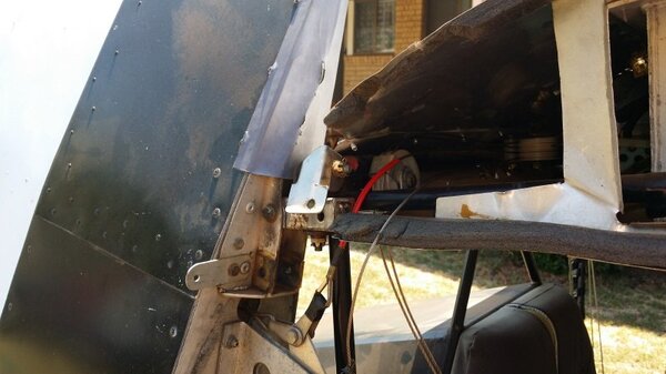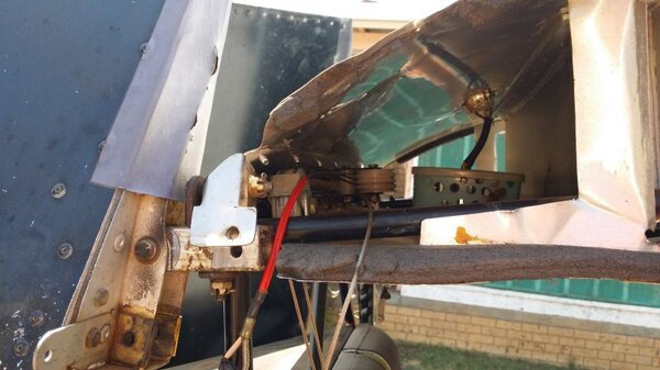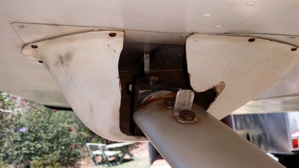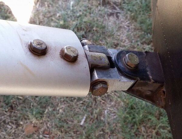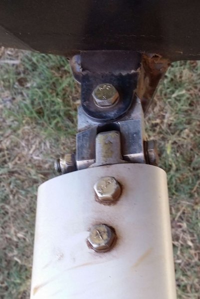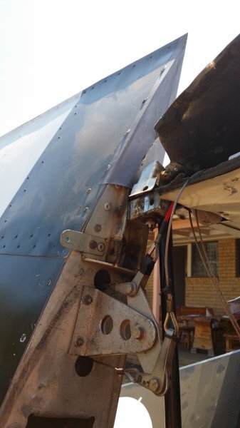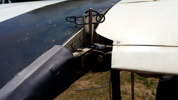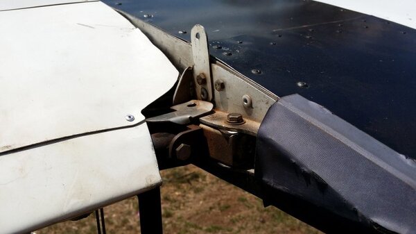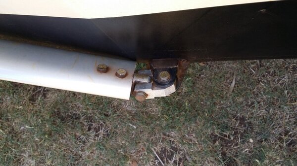 For those who may not know the Trail, it has a wing-folding system that also folds the wings flat against the fuselage but it's the front spar connection that remains connected when folded, rather than the rear spar connection. This has the very distinct advantage of making the whole folded package shorter but it has two disadvantages - The folded package is very much taller. That doesn't matter if you're only going to store it in a hangar (as long as you've got very high hangar doors) but for trailering it means the windage on the side is substantial and requires more care when driving. That's not to be scoffed at, I lost a very good friend in the late 1980s when their ultralight plane's trailer was blown off the road by a willy-willy taking the tow-car with it and they hit a tree. When folded the majority of the wings' weight is above the spar attach point and so the wing is unstable and requires additional bracing members to hold it in place when trailering, that takes additional time to install when folding and unfolding the wings. Here are a couple of pics of the Trail - Some while ago I was quite astounded to find that in general engineering bolts are used in tension whenever possible and in shear only if a tension orientation cannot be achieved. It's only in aircraft that you see a lot of situations where the bolts are used in shear, and this is mainly where the same bolt can be used in double, triple/multiple shear, like a wingspar folding knuckle, or where rod-ends attach on a control pushrod, for examples. Interestingly a 'proper' bolt can realise its full tensile strength against the thread of the nut and in testing should elongate and eventually snap at the transition between the thread and plain shank. The (single) shear strength of a bolt is only about 2/3 of the tensile strength. For a very relevant example of 'general' engineering using bolts in tension - ALL lifting lugs (craning points) are attached using bolts in tension, never in shear. There is a caveat to the above though - the bolts must always be properly torqued to the correct values for the bolt size and threadform to prevent the thread fretting when loaded and unloaded, so the 'loose' bolt for the rotation in the upper strut assembly of the Groppo is an absolute no-no, eventually the threads must wear out from the cycles of flight loading. OK, the 'diaphragm' aspect. I agree, it's not attractive from an engineering viewpoint on the Groppo but I suppose all bolts in tension are acting through a 'diaphragm' arrangement in some sense, it's just the thickness of the diaphragm that varies, make it thick enough and you're bolting through a block ... which is the direction I'm headed, the bolt used for the rotation goes through a thick aly block which is milled to provide a pair of cheek plates/clevis for the connection to the next part. Going back to the bolt used for rotation - I can't see a way around using it in tension, and for the reasons given above, there's nothing wrong with it at all but I will be trying to source a long nut, or machining my own from chromoly. There's probably no need for that but if it makes me feel better ... Then, that bolt must be fully torqued and that means it must have a sleeve on it and be torqued up onto that, and the rotation takes place around the sleeve rather than just around the bolt. ...................... Referring back to your photos of the Groppo strut-to-wing attachment, it has one axis of freedom (hinge) and one axis of rotation. When I studied The Mistress in the same location it has two axes of freedom plus the rotation. I haven't actually made a model of the system but I have been wondering if the second axis is really necessary and the Groppo photo shows that it isn't essential BUT you can see that if you don't rotate the wing as you extend it, exactly at the time and rate that the geometry demands, then you will be stressing the attachment fittings. The second axis prevents this stressing, as far as I can see at this stage, and means that all that is necessary is that you rotate the wing at some time between the folded and extended positions. Incidentally, the upward angle on the lower strut attachment fittings that you commented about previously, apart from aligning everything when the wings are extended for flight, does serve another very useful purpose. When the wings are folded the strut 'slumps' into the folded position which means that even if not secured back the wings will not inadvertently swing forward if the tail is lifted above the horizontal, this could save a lot of red-face in the hangar ... I'll post some photos below, of the fittings on the Mistress upper strut end, and also of the rear spar attachment. The latter is a rather untidy affair and is probably the result of a bit of trial and error on the part of the designer/builder (he was a German toolmaker and obviously very talented). It's an arrangement whereby a small member carrying a hinge in one axis swings out on the other axis (when it isn't swung out both axes are locked with a vertical pin), I have in mind to make that a lot tidier with a similar connection to the lower strut fitting, getting rid of the need to remove an extra pin, with the associated hazards of forgetting to replace it before flight. The Mistress's version does however provide the benefit of elongation in that area when unlocked which gives extra clearance for folding as the flap control rod disconnects and the flap droops - I'll use a spring to hold the flap up instead, and a small removable fillet fairing. The first photo shows the upper strut fitting on the Port side. The bit that is bolted into the end of the strut carries the bolt for rotation, then there's a heavy clevis with vertical bolt for fore/aft motion (in theory I think that's the one that isn't entirely essential but might be better considered as 'good practice'), the clevis carries a block (like the lower strut fitting) with horizontal bolt for vertical stru