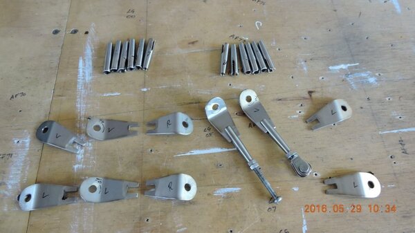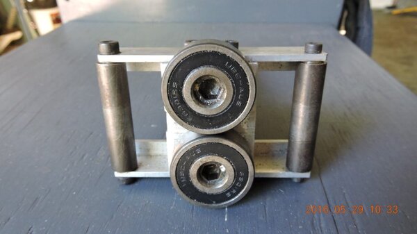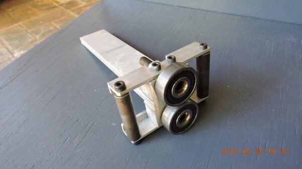 29th May 2016 After completing the strut attachment points I posted about previously, I fitted a small bracket to the top of the aft fuselage to carry the VHF antenna and then made and welded in the harness attachment points. I forgot to take photos of them so I'll post them next time. Pylon500's comment about the length of the elevator pushrod had been gnawing away at me in the background so checked my buckling calcs and it still came out fine but when I was wheeling the fuselage to the workshop over the gravel driveway the push-rod had a very noticeable bounce in it that just doesn't look good. Oscar very generously had sent me some Purathane material to make a grommet to support the tube mid-span but that would still mean it would flex and any contact with the grommet would cause some wear and it's a very thin-walled aly tube (0.035"/0.9mm). The amount of work required to make the grommet and its support would have been as much, if not more, than the work to add another walking beam and divide the long pushrod into two. I was a little miffed at myself for having to do that at this late stage, and particularly because the two ends of the pushrod that attach to the walking beam would be attached in tandem and the Ackerman Effect would slightly change the elevator geometry, affecting the up and down ratios. Then I realised I could place the two rod-ends beside each other rather than in tandem and not have a geometry change. At first it appeared that doing that would introduce a bending moment in the pushrods but it isn't actually the case, all of the bending is resolved in the bolt and cleats that hold the pushrods to the walking beam. Problem solved, so I machined up the new pair of large pushrod ends, and made the walking beam and attached its hinges to the lower fuselage between the rudder cable-guides. Photo of it installed next time but here's the walking beam frame - Next I made up a couple of flanged plates to go above the cabin and secure the clear polycarbonate sheeting that forms the cabin roof. I used a tool that I'd made a couple of years ago for another project. It's a pair of ballraces mounted on socket head cap screws that I'd machined eccentric so that by turning the screws the rollers move closer or further apart and can be adjusted to roll different sheet thicknesses. Ahead of, and behind the two horizontal rollers are two small diameter tube rollers also on ball-bearings, that are set a little lower than the bottom of the horizontal rollers. There is one more roller, vertical, between the two main rollers. By feeding the sheet vertically into the slot between the main rollers and keeping its edge on the approach side feed roller the sheet bears down firmly on the fifth, central roller, allowing you to put sideways pressure on the sheet and roll a flange along its edge. The edge can be curved or straight and due to the limiting roller between the main rollers, the flange is always the width of the horizontal bearings - 12mm in this case. I then used crimping pliers to remove the excess material which was due to the curved edge and the stretching during rolling, to leave a flat flange. Life got in the way for the next four weeks with an overseas trip, re-springing a couch, fitting curtains, building a built-in robe, a birthday BBQ for my wife and my drafting work got busy too so it was a hectic time and I haven't touched the plane until this weekend. By then I'd lost all momentum and it was a case of staring at it for a while to decide what to do next. Somewhere among the above other projects I'd managed to order some quality 316 steel rigging cable, a hydraulic swaging tool and a bunch of wire balustrading hardware to assess for suitability. The first test was to get a couple of friends and the three of us bounced around on some balustrading that had been installed on a job I'd drafted a couple of months ago. It stood up to it surprisingly well, nothing broke though we did stretch the wire. I went to the stainless company and was let loose on their test-rig for an hour and came back well informed, the balustrading hardware will easily carry the loads for my tailplane bracing. I'll be test loading it later in any case ... The stainless swaged ends for the cables are as light as they could be and still do the job, and having threaded ends they can be used to do the cable tensioning. I didn't want to use the bottle-screws as they were, they'd be too bulky, so I cut them in half - which gave me the left-hand and right-hand threads I'd need for the tensioning. I could have done the same with ordinary left and right nuts but I wanted more (longer) thread and the bottle-screws have 11mm of thread internally. So making up the cleats and welding them in took up the rest of the weekend. Back to work again tomorrow, ho hum ... Another 38hrs for the log, 1072hrs so far. -