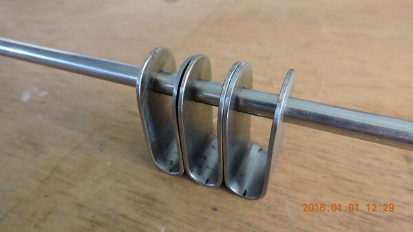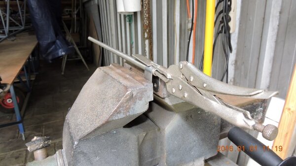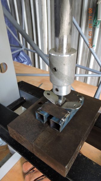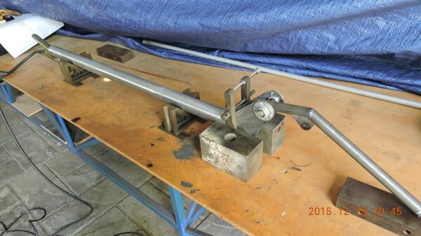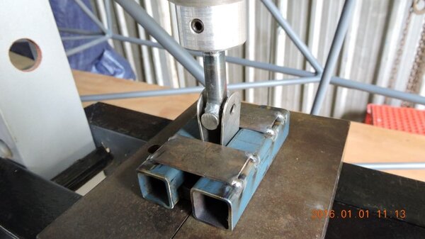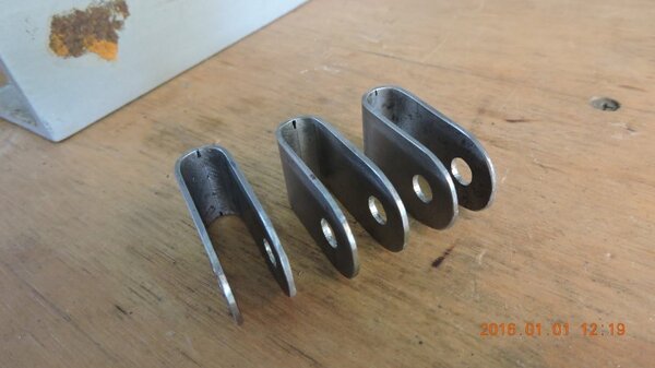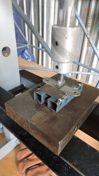 December 23rd 2015 =- January 1st 2016 Being the festive season break I was hoping to get a lot done on DooMaw but Murphy did his bit instead and my wife and I spent most of it getting over minor injuries from a car smash and all the resulting palaver that goes with it, in terms of insurance estimators, tow trucks, getting her a temporary vehicle and so on. Not much fun at all. In between it all I did get some time on DooMaw and it was enjoyable work, having got past the last of the contortions required for welding in the inside of the fuselage structure, now most of it is making bits separately and welding some of them to the outside of the fuselage, much less tedious than it has been of late. Ten days ago I'd just started making the parts for the control stick and aileron torque tube - see last photo in post #69 above - the three small tubes and one longer one, not shown, form the triangular support for the rear aileron torque tube mount and also part of the progressive failure structure for the seat-back. Those four tubes should be the last bits that needed welding to the internal part of the the fuselage, so I got on with those first to get them out of the way. Then I had to add three flat plates to attach the HDPE triangular torque tube support, and tack them in place without harming the easy-melt HDPE. A bit of thin PTFE sheet for insulation and fast tacking and I got away with it, just. Then could fit the front torque tube mount that carries the split square block which resolves all the thrust loads from the elevator push-rods. The front mount needed some delicate welding procedure and order to keep everything aligned but it did end up pulling so that I needed a 0.020"/0.5mm shim under the front two bolts, which irked me a bit. Making those blocks has been a bit of a trial as I got rid of my large milling machine a while ago intending to replace it with a much smaller one but haven't found what I'm after yet, so have had to make those parts with a pillar drill and flap disks. Not very professional but they came out well enough and accurate, so it was annoying that I underestimated the welding pull and needed to adjust them. In the end I decided it was time to service the linisher, all of it's bearings and the drive belt died some years ago, so I spent a day on it and found the required parts and that meant I could linish half a millimetre off the bottom of the block at the required angle and avoid the shim, so I was happy again. And the control torque tube runs smoothly in it's two bearing blocks. Next I set up the tube to add the cheek plates which carry the pair of bearings which attach the joystick, they needed to be very accurately aligned so that the elevator pushrod runs centrally down the middle of the torque tube, so I jigged it simply in steel V blocks and with the bottom edges of the cheek plates on a pair of parallels. Next I added the thrust washers, stitch-welded to the torque tube to avoid distortion and aligned by using a split sleeve of the torque-tube material held in place with a hose clamp, to back it up while tacking it in place. I had to split the sleeve into two to tack the second thrust plate, so that I could remove the sleeves afterwards. Last I added the brackets for the adjustable control stops on the top and bottom. I made and fitted the flat plate that the HS front spar will bolt to, and also the bent plates that will carry the elevator bellcrank. Then I started to make the hardware for the elevator bellcrank and pushrods. I needed bent clevis plates to weld into the ends of 3/4 tubing that will form the arms of the bellcrank, and the elevator control horn. A ball rod-end will fit between the clevis plates. I've tried making these previously and it's not easy to get the bend in the plate even and to drill the holes after bending and welding the plate in, but that's the only way to get the holes properly aligned. So this time I decided to make a simple press-tool to make them. I measured and marked out the plates carefully and cut and drilled them first. Then made the press-tool to fit into a 6 tonne toy shop press, and it worked a treat. It took a bit of careful consideration to line up the top and bottom press-tools accurately enough and the plates didn't fold fully parallel but a little extra squeeze in the vise afterwards and some judicious adjustment with a piece of 1/4" silversteel rod and I had three quite closely matching clevises ready to weld into the tube ends. Another 36 hours for the log, making 564hrs so far. -