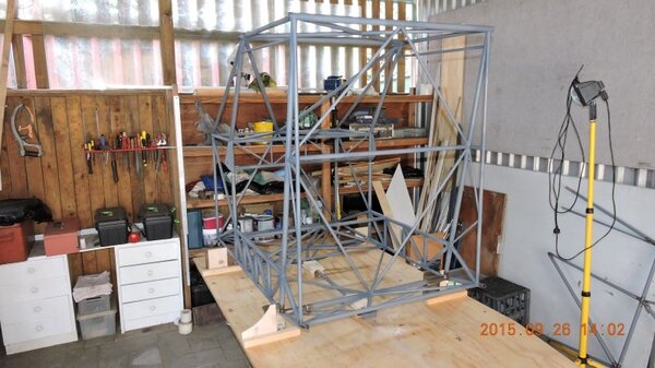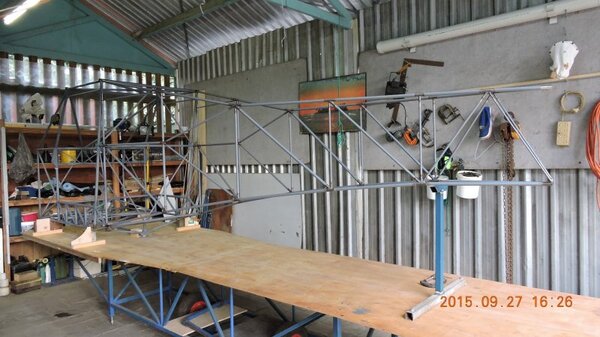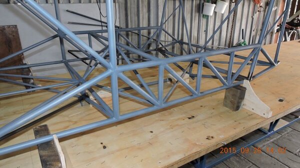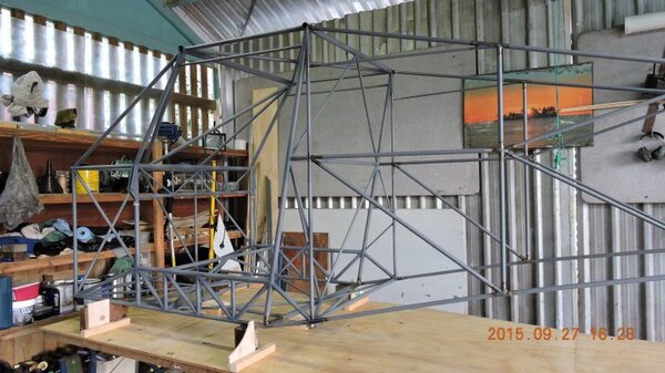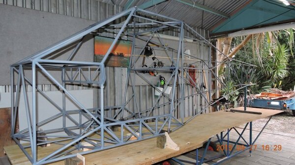 Another busy work week so only the weekend to get a bit done on DooMaw. As mentioned last post it was time to get the rear fuselage sides attached to the cabin. First I had to solidly lock the cabin frame to the workbench with it level and central on the bench so that I could use the flat bench and a central chalk-line as points-of reference. A number of steel blocks, shims, wood-blocks, pieces of plywood, lots of screws, a few bolts and three hours later the cabin frame was set up and totally rigid so I could be confident nothing would move later. Next I checked the CAD model to determine the height that the tail sections of the fuselage sides needed to be above the bench and built a support frame from scrap steel and bolted it through the bench frame. Then cleaned up and notched the ends of the longerons and created the fish-mouths in the end of the cabin longerons where the rear longerons would splice into them. Introduced the rear sides to the cabin frame and with a touch of a file here and there it all fitted together perfectly. I used the self-levelling laser for a double-check that everything was level and central, it was, but I wanted to be sure, there'd be nothing worse than a banana shaped fuselage and nothing could be done to put that right later, so it was good insurance to spend an hour to laser check it all. Once I had it all balanced in position I could haul it tight with chains and turnbuckles and tack it up. Next weekend it'll be the old deja vu same-old-drill thing again - I'll need to make all the rear fuselage cross-members and bracing so it's back to the CAD work to create more wrap templates, cut the material, sand the mill-scale off in the lathe, paint the tubes, mark the ends with the templates, notch the tubes, fit them up and tack them ... all before I can get to the stage of welding out the rest of the fuselage frame. Nonetheless it's coming along, some pics below show the progress. Another 17hrs in the log, making a total of 409hrs so far - -