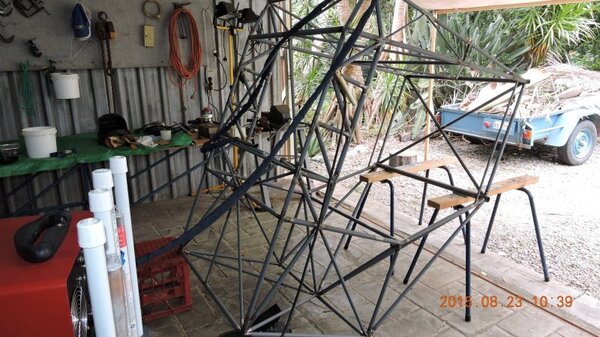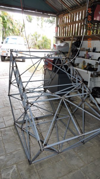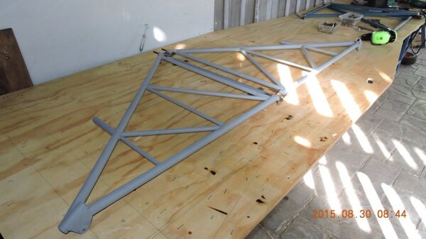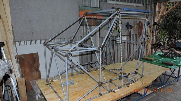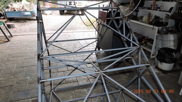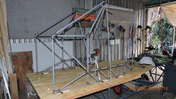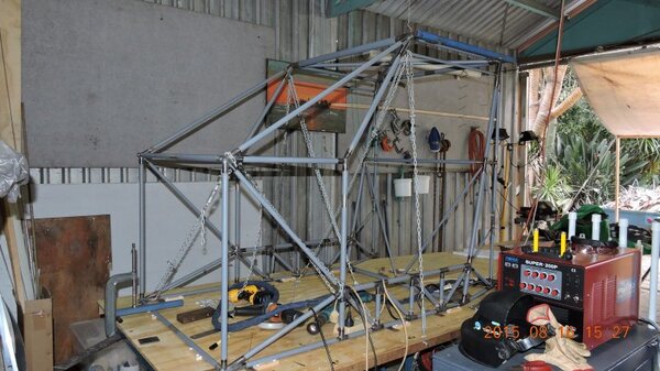 Nice progress this week, starting the assembly of the two sides. It's good to see the shape coming together but the welding gets a lot harder, getting access to the insides of the frame to tack it all together when you can't rotate it into position is hard on the ageing back but probably good for personal mobility in the long run, certainly a lot better than sitting at a desk a lot of the time like my 'real' job. The rest of the stencilling took a couple more hours then 15 hours to notch all the ends. Next I had to make a very accurate jig for the top frame so that the carry-through members that the wings connect to are perfectly aligned each side. It involved a bit of machining, clamping, welding and gladly turned out very well. That allowed me to assemble and fully weld the top frame with its cross-bracing in the jig so that ensures that the wing rigging will be accurate and was also a lot easier way to weld it than as part of the main cabin frame. Following that I checked and re-adjusted the levelling of the bench - the earth around here moves a fair bit according to moisture content and the laser showed it had moved 3mm across the feet of the bench which is magnified to 6mm across the full length of the bench. Easy to adjust with the threaded feet on the bench, then I could start to mark the positions for the wood blocking that holds the bottom of the side frames parallel. Installed the blocks and packers to keep the bottom rails off the timber so that the larger cross-members could fit under them and then had to devise a means of holding the side frames vertical. I used small chains and turnbuckles a bit like rigging a yacht mast and had to add some chains under the bench as well to balance the load on the top edges of the bench. With that in place I could set the laser up on top of the bench and set the side frames level and vertical, now it was nice and easy to adjust with the turnbuckles opposing each other. Then I could drop the top frame on and was delighted to see it fitted almost perfectly, a light touch of the grinder and it dropped into place with barely a visible gap anywhere. That meant I could then remove the external jigging frame and add the side fore and aft members. None of those are welded in yet, I need to get all the vertical bracing in place before doing that. With the top frame sorted I could turn to the front and rear cross-members, final fitted them and tacked them in and then added the vertical bracing. I used a couple of extra chains and turnbuckles to fine adjust the alignments where the complete welding of the sides had pulled them out of flat by a few millimetres. Then I added the front horizontal bracing behind the instrument panel and the whole assembly is locked up and rigid so I could move the bench aside to put the car away for the night. There was 41 hours in that lot, so the log shows 286 hours so far. Some pics - [ATTACH]37355[/ATTACH] [ATTACH]37356[/ATTACH] [ATTACH]37357[/ATTACH] [ATTACH]37358[/ATTACH] [ATTACH]37359[/ATTACH] [ATTACH]37360[/ATTACH] [ATTACH]37361[/ATTACH] -