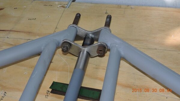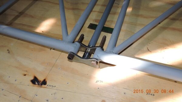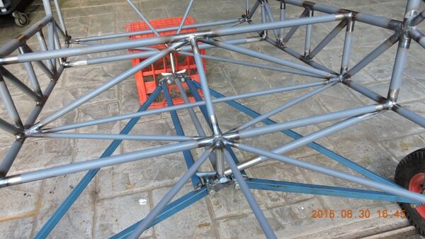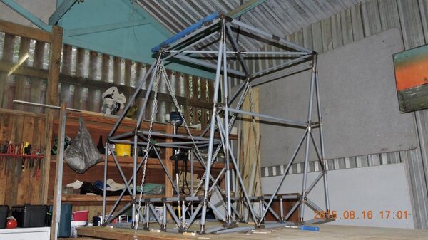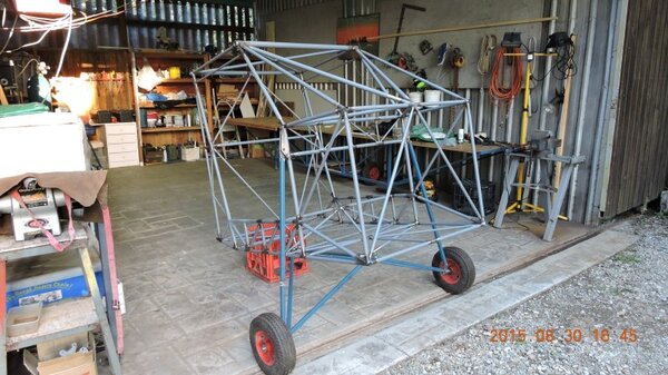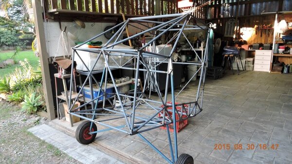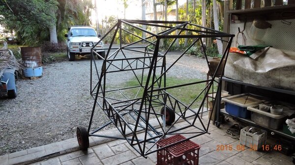 24-30 Sept 2015. Another busy week. Last post I mentioned there was still another day of welding to weld out the cabin frame, it seemed like it was almost done and I thought I had completed all the most difficulty clusters. Actually it took another 14 hours to finish off that part. Next I added the parts that form the truss behind the instrument panel and which stiffens up that zone which has to resolve the forces from the landing gear oleo struts. It's just a few small members and easy to get at for the welding on the inside i.e. from the side where the crew will sit, but very hard to reach from the other side i.e. the foot-well side. I ended up trying to weld while curled up in a ball, all entangled in the frame members. And of course every time I thought I was ready to weld I'd find that I had forgotten a glove or filler rod or something and have to extricate myself and start all over again. All part of the rich tapestry and all that, but those few members took another 7 hours to fit and weld. Following that I went back to the CAD work to check the actual dimensions that the frame would be when it is on its wheels. I needed to know this because when I add the rear fuselage the frame will become too heavy to easily manhandle on and off the bench every day, to make room to put the car away overnight. The plan was to get the frame onto its wheels as soon as possible so that I could wheel it into one of the parking bays under the house for storage when it wasn't being worked on. I can't put the car under the house instead because the car is just a little too high. Typically when I measured it the plane would be about 100mm too high also, and that is even if I put some small wheels on, with the real wheels and tundra tyres it would be way too high. I thought about using really tiny wheels, maybe just solid plastic wheels 100mm or so in diameter but then discovered the track is also too wide so I realised I would just have to make another set of gear legs much shorter than the real ones. I bought some cheap 20x1.6SHS and fabricated a set of temporary legs using a pair of barrow wheels that I've had lying around. I stencilled and cut out the bracket hardware for the gear leg attachment points and jigged them up onto the central gear support member using the real gear legs to set everything up in alignment on the bench. Tacked then welded those brackets and re-assembled it all to make sure it hadn't pulled out of shape while welding and that the legs still hinged freely throughout the whole suspension motion. Before the weekend was over again I then just had time to tack enough of the gear support members to the cabin to be able to install the wheels and move it all under the house. A busy few weeks of real work ahead means I won't have so much time to spend on the plane, but the next stage will be adding the rest of the gear support members then welding them out before being able to start on attaching the rear fuselage. Another 39 hours in the build log, a total of 364 hours, some more pics tell the story so far - -
