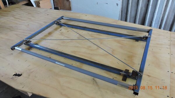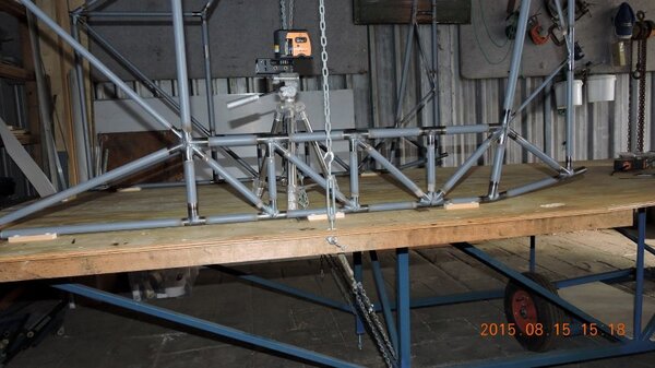 Nice progress this week, starting the assembly of the two sides. It's good to see the shape coming together but the welding gets a lot harder, getting access to the insides of the frame to tack it all together when you can't rotate it into position is hard on the ageing back but probably good for personal mobility in the long run, certainly a lot better than sitting at a desk a lot of the time like my 'real' job. The rest of the stencilling took a couple more hours then 15 hours to notch all the ends. Next I had to make a very accurate jig for the top frame so that the carry-through members that the wings connect to are perfectly aligned each side. It involved a bit of machining, clamping, welding and gladly turned out very well. That allowed me to assemble and fully weld the top frame with its cross-bracing in the jig so that ensures that the wing rigging will be accurate and was also a lot easier way to weld it than as part of the main cabin frame. Following that I checked and re-adjusted the levelling of the bench - the earth around here moves a fair bit according to moisture content and the laser showed it had moved 3mm across the feet of the bench which is magnified to 6mm across the full length of the bench. Easy to adjust with the threaded feet on the bench, then I could start to mark the positions for the wood blocking that holds the bottom of the side frames parallel. Installed the blocks and packers to keep the bottom rails off the timber so that the larger cross-members could fit under them and then had to devise a means of holding the side frames vertical. I used small chains and turnbuckles a bit like rigging a yacht mast and had to add some chains under the bench as well to balance the load on the top edges of the bench. With that in place I could set the laser up on top of the bench and set the side frames level and vertical, now it was nice and easy to adjust with the turnbuckles opposing each other. Then I could drop the top frame on and was delighted to see it fitted almost perfectly, a light touch of the grinder and it dropped into place with barely a visible gap anywhere. That meant I could then remove the external jigging frame and add the side fore and aft members. None of those are welded in yet, I need to get all the vertical bracing in place before doing that. With the top frame sorted I could turn to the front and rear cross-members, final fitted them and tacked them in and then added the vertical bracing. I used a couple of extra chains and turnbuckles to fine adjust the alignments where the complete welding of the sides had pulled them out of flat by a few millimetres. Then I added the front horizontal bracing behind the instrument panel and the whole assembly is locked up and rigid so I could move the bench aside to put the car away for the night. There was 41 hours in that lot, so the log shows 286 hours so far. Some pics - -