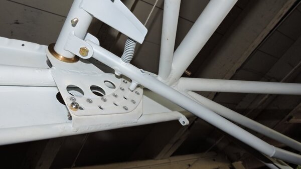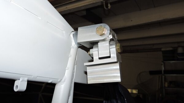 Well, I'm back on the case with DooMaw at last. Some while ago I made the front spar attachment fittings and installed them as well as the rear spar fittings shown in post #255. I'd also started to make the parts for the aileron and flap torque tubes in the cabin roof which provide for the automatic connection and disconnection of those controls when the wings fold. They're the bits that go with the 'dogbones' that some may recall I made from the drilled balls in rodends, described in posts #175 and #176. Coincidentally, that was two years ago today! Last week I made the rest of those parts and welded them onto the ends of the cabin roof torque tubes and cross-drilled the fittings on the other side to bolt them on. I also made the flap control handle and the spring-and-detente mechanism and fitted that to the flap torque tube. Then made up the short pushrods that connect the aileron bellcranks to the aileron torque tubes and fitted the whole lot together. A few small adjustments with shims and it all moves very smoothly and freely without any discernible play or lost motion. Some pics - Another 19hrs for the log making a total of 1899hrs so far. -