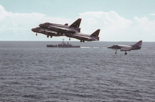 25. Lightnings fly past HMAS Melbourne in company with a RAN Skyhawk during exercise Bersatu Padu (complete unity) in 1970.