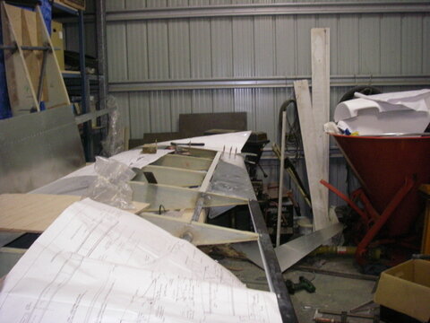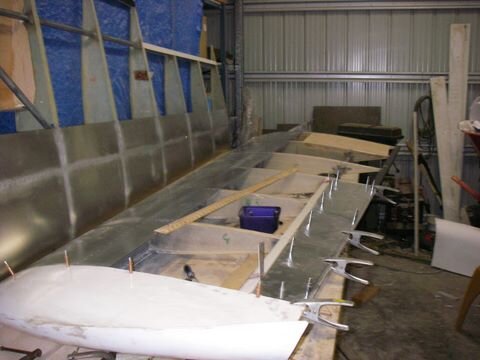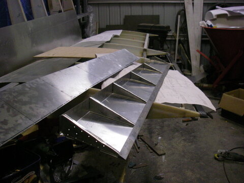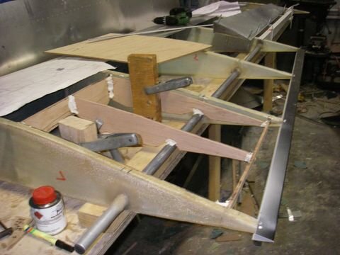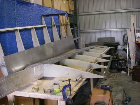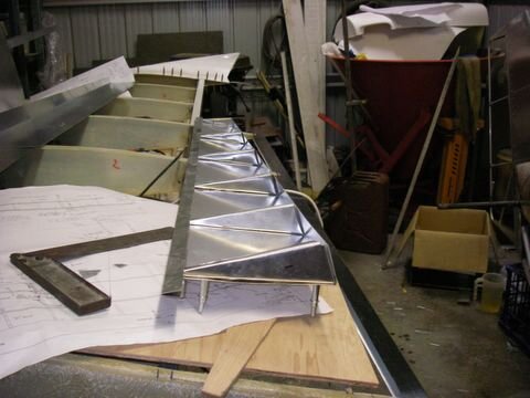 Winging along Big weekend, no birthdays (none I couldn't avoid anyway). So I have my rivets, Yeeha, look out the 2nd D box. I cleaned off the bench which somehow had got way too full to fit a wing, then I got the wing from its precarious position of "just lean it here for now", and the sheet from "try to step over it until the rivets get here" and tied them together. Then I re setup the washout. (all those water lines;)) This time I wanted to get it done without ripples, so I put the ratchet straps back on, then clecoed up the leading edge so it sat hard against the rib. That left no clecoes for the spar ( I only have 25) so I just had to hope that was right. Started riveting the top of the leading edge, that all sat pretty good, except for 1 rib, very small ripples in that, but I figured I could pretend they didn't happen, and not admit to them. (Ummm, then why do I tell everyone on the net? Duh). Started on the bottom of the leading edge (the 'danger zone'), riveted from the front back. And.................. I got it !!!! No ripples! I am a legend!. [my boss wasn't so ecstatic "now she'll go better around one corner than the other since the first wing isn't as good"]:;)4: Riveted the trailing edge of the sheet next. I figured that that was what held the washout, so if that was right, the spar could do what it wanted. So lastly I did the spar. With all the other rivets in, it was just the time to find out my compound mistake. First part; I drilled the holes with a 1/8th drill instead of a 1/8rivet drill (rivet drill is slightly larger, the rivet expands to fill it. 2nd part; I coated the lot in etch primer, and it went into the holes,,,,,,, and I hadn't cleaned it out. So 90% of the rivets needed gentle persuasion to get in. That really made it fun:confused: In any case; it got done. And only then did I notice a grain of course sand in the D box:black_eye:, that'd be right. Not as bad as it sounds, it is in the first 'bay', and there is a gap between the rib and the spar, so at the right angle, it should come out. It flies at the necessary angle, so if I don't bother getting it out, it should fall out. I also made the wing walk, or part of it. This one is a bit more complex since the ribs face the other way, this means that the side supports can't be rivetted to them. It needed 2 extra supports, and relies on the bonding strength of fibreglass. Actually I could have used liquid nails, but I didn't have any on hand. So the other wing is takeing shape. Still a lot more to come. -