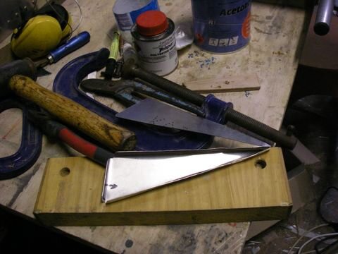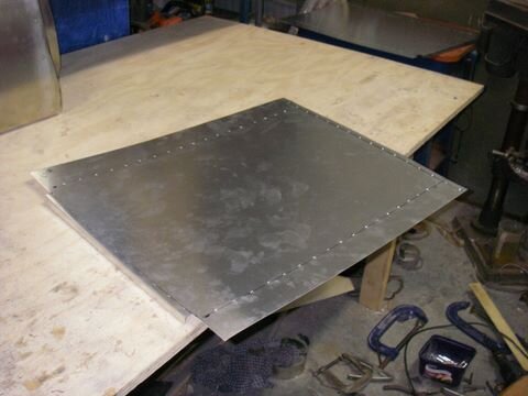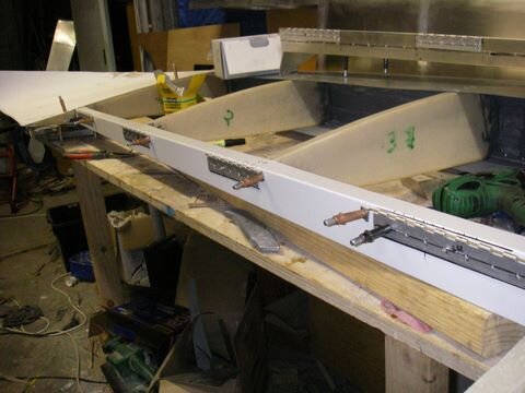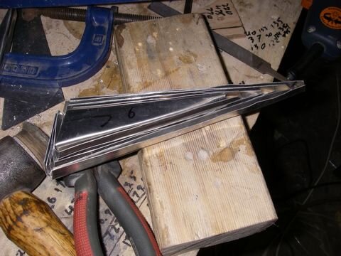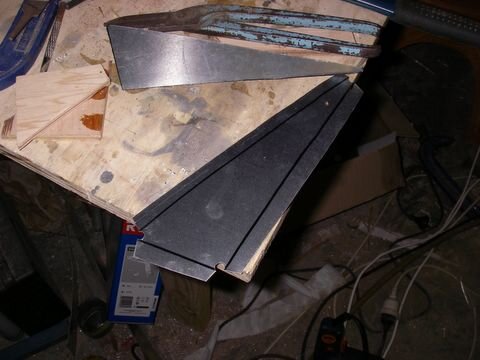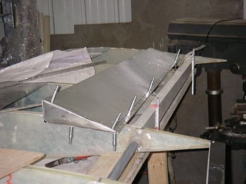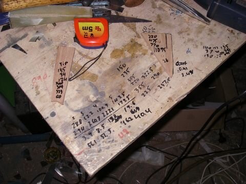 ailerons from h**l, or somewhere else hot You know them things which make a plane rock its wings? (when the plane's rocking, don't bother knocking [shut up, not that]) Those ailerons which are taken for granted, are a real nuisance to make. For starters they use 3/32 rivets which means more clecos, then they need to be deburred, but clecoes get in the way of setting it up to drill the trailing edge and on top of that the ribs need to be folded, and the sizes are "find out yourself" and three quarters exactly.;) So, pick an average value for the angle of the front of the aileron, I said 65 degrees and that seems fine. Then trace the profile of rib 4 (root of the aileron) and work out a template. Then I put the wingtip on and did the same there. Great, now I have 2 templates, and still no rib. Okay. So now try to make a rib. Um, scrap that one, try another <and so forth and so forth> Finally, one which looks right. I found if i used 5/32 holes in the corners, it was easier to get precise folds in it than if I used a larger drill size. Then I made one for the tip. Nice size, bent the wrong way. Another, and another [for a long period of annoying time] Eventually I had a pair. Now I need 4 more, with nothing to compare them to. And since the aileron is tapering, the spaceing is not the same. I tried to work it out to mathematical perfection, but found the formula to be recursive, and I didn't feel like calculus at the time, so I approximated it, gives it a bit extra differential, but thats OK. Then came the fun part. I knew the measurements of the root and tip ribs, so i applied an even size decrease to them and found the size of the intermediate ribs. sounds simple, look at my calculation sheet, [ATTACH]3649.vB[/ATTACH] Then I found I had made the infamous 100mm mistake and had to do half of them again, [ATTACH]3651.vB[/ATTACH] So now I knew the size of the front and the top, and the angle was constant, and that let me make the other ribs. I spoke to Garry about it today, he said he just puts root and tip onto the aileron, then measures the others. Still my way is more fulfilling;) I had already trimmed the sheets to length, they are supplied pre bent, so that is some consolation. clecoed the ribs to the top [ATTACH]3652.vB[/ATTACH] put the bottom on and clecoed that. Now that has to be held while drilling the trailing edge, since they make [or hold against] the twist in the aileron. But when holding it in place, the cleco get in the way. So with a bit of trouble, I got 2 clecos into it from the inside. Then I held the hinges onto the plate with rubber bands, then got Lex to hold it inline with the wing while I drilled it. Drilled it at 2 inch centres, should be closer but it will do. Wasn't sure if it needed more holes, so I couldn't finish it the other night. but almost there :) -