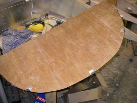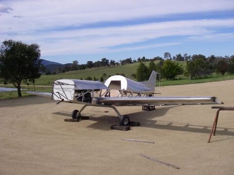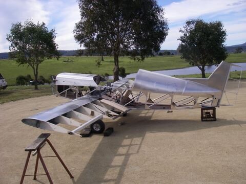 Darn the wind Just a short summary or this weekend, need my sleep badly, I will be a wreck before this is finished. Got her outside and the wings on, drilled the drag spar mount. Garry says just put them where they fit, but I measured them, and found that they both were out a bit. I think the spars develop a slight curve in them when they are being made, both wings were out about the same amount, and in the same direction relative to the spar. Straightened them out before I drilled them. This means that it will be hard to put the drag spar pin in in future, it should straighten itself out I hope. While it was on, I put the aileron cables in, this was pretty easy. Then I started making up the control rod extensions, and had one made up when the wind picked up and I had to get her back inside. Derigging in the wind is hard for one person. So I got her back inside. got some brake lines installed, including some elbows which I had to get extra, it allows for greater adjustment of the pedals, and doesn't crimp the line. Then I made the other side of the cabin. I fixed this to the logerons with M4 screws so I could remove it later to add more cables. I didn't have an M4 tap, so I made one by cutting a slot in an M4 bolt. Works fine, even for the bolt in the steel frame. Then I focused on making the panels for the first section of wing. This is harder than it looks, and to make matters worse, it is visible in the finished product. I bent the front edge for extra strength, then fixed it to the ribs and D box sheet. I marked the trailing edge onto it, then measured 10mm in for a sensible lap. Snce this join is visible, I didn't want to have shear marks on it so I scored and ripped it. I ripped it downward so the edge actually has an inwards curve which hides the join, this makes it look a lot neater I think. Then I had to countersink all the holes and deburr them as well. So after 4 of them, there wasn't much weekend left. And I have to work tomorrow, no long weekend for me, I need the money. -