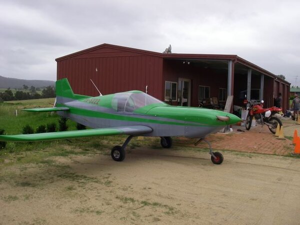 4 cylinder, which, by my calculations, should have 2/3 the problems of the 6.:confused: As for the green paint; there is still some on my fingernails, and I have had to have a haircut. Cruising speed, it will be interesting to see who gets better. They both should be about 110kts, Slarti has winglets to stop induced drag, but has a higher cabin and a steeper front on his canopy. He has a professional quality build which might make it smoother, so it will be interesting. The winglets on Slarti's are an expensive extra, and were not available when I got my kit. I could always fit them later with a bit of difficulty; maybe when I fit strobes and nav lights. Garry was just talking to me on the phone trying to scare me out of test flying my own plane with very little experience, but I still want to try. If there are any mechanically minded pilots in the Moruya area reading this, I would appreciate it if you would turn up at the airport on Friday evening for the prep. or Saturday early for attempt number one. I'm hopeing Rex the maintenance bloke from Merimbula might turn up, that would be good. In Gods hands. PS Sorry Blueshed, but the 16th happens to be my 21st, so I will probably be in no state to fly.