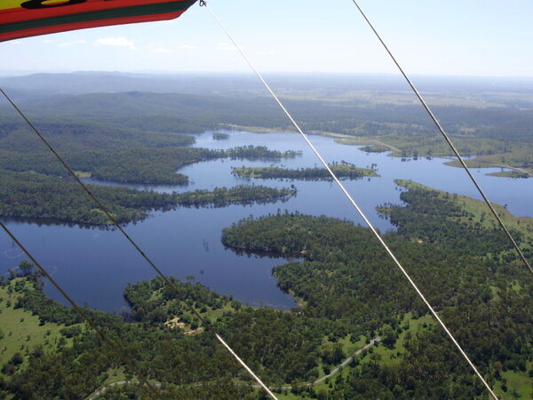 Hey Greg, you're not alone in secretly loving Drifters - I was exiting an A380 past the cockpit and I saw the pilots at the door, I asked if I could say hello and they said OK, one an Aussie and the other a Kiwi ! They said I could have a quick look at the cockpit (I knew what it would look like from my flightsim) but I was gobsmacked by the size of it - you could have a party in there m8 - and all so simple and uncluttered. When I mentioned the Drifter I said that they fly the biggest and I fly the smallest, the Aussie said he'd always wanted one, the Kiwi said he'd seen one at a fly-in somewhere and thought it was a great little machine - they went off talking about where they could hangar one if they went halves in it !!!!! That was one of my favourite aviation encounters. I had a TIF in a trike a few years ago (wanted to see Bright in Victoria from the air) and was amazed by the reversed controls and delay in control inputs to the aircraft, compared to the Drifter it was so different. The Drifter has very light and precise handling with quite minimal pilot inputs (a lot like a glider). Those full length ailerons the reason why they are so sensitive in roll, and the tail-feathers are actually quite big for the size of the aircraft too, so same same. You will hear people call the Drifter a "hands and feet" aircraft - particularly feet, primarily during the take-off roll. With the light weight and pusher prop throwing prop wash over the rudder, take-offs are the hardest thing to learn, at least for me it was. It's all about a gentle application of power (around 3 seconds) and rudder inputs that are both quick to react and with enough authority. Once I got those concepts going I went solo in an hour. There are two types of take-off procedures - the easy one is to just leave the tailwheel on the ground during the roll and when the aircraft reaches flying speed it will simply lift off. The other one is (I think) practiced by most tailwheel pilots, this is how I was taught - a little forward stick is used at the start of the roll and the tailwheel will lift off gently once elevator authority is active. The tailwheel is held there as the (level) aircraft accelerates, at about 50 knots the main wheels are popped about a metre off the ground until 60 comes up, then rotate and climb away. Enough rabbiting for now, hope the weather is good on 4/11/2017 for you and your new obsession. Looking forward to seeing some more pix of the lil' beasty once you get it home. Added a photo taken by one of my lucky passengers (16 year old local girl) over Wyaralong Dam (near Beaudesert). BP