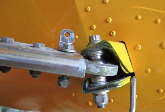 22. I hope this doesn't cause a huge problem, but if you have the strut fitting pivot bolt angled to be square with the strut, what are you doing to align the bolt, when the wings are folded back? The Kitfox (and it's clones) keep the bolt vertical, in the axis of the wing fold, and have the strut attach fitting angled on the strut. Because the strut to spar angle on my Stollite was angled, I opted to use a ball joint style fitting to make up for the misalignment. Wing is folded in this view.