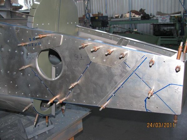4. Ok time to fit some sides to the main cockpit. The panels are cut oversize to start with. David would know old mate "looking in". One of life's gentlemen. Not a big job? Well you clamp the panel in position then mark around all the frames on the inside, take the panel back off and measure and mark where all the rivet holes go then double check all is OK before you start drilling. The sheet is drilled on the bench. Re-clamp the panel back in place and check it all lines up before you start drilling the frame. Drilling through the panel and locking in place every 4th hole with a cleco you make sure it lays smoothly over the frame as you go. Not too many holes to drill in these skins for the rivets considering the 16 odd thousand rivets in the whole build! Now that is all pegged in place with the clecos and it fits the way it is suppose to you can mark around the panel for the final trim to fit and overlaps etc. Take the panel back to the bench and trim to the finnished size. Now you can start de-burring. Every edge, corner and hole has got to be de-burred on both sides. The frame and the skin. This is important not for looks or so you don't scratch yourself but to the strength of the whole build. You must make sure all components are rivetted or bolted together without being held appart by burrs or swarf. There are some fancy tools for doing this, and in some tight spots too but a cordless drill is your main choice of weapon if you can get to it. When you have that all done it is time to clean the sheet and frame with metho (keeping David Isaac away from the bottle if you want any left) so it can be undercoated. No two pieces go together without being painted. Now you can peg the skin back in place, every 4th hole with a cleco. Thanking your God for air tools you can now start riveting the skin in place. One side done, start all over again on the other side. You must also remember where another skin is to fit under or over the skin you are fitting not to rivet but just leave the clecos holding it till you fit the next skin. That is the process for the whole build. Components on then off maybe more than once, drill, de-burr, paint, refitt and then and only then can you rivet. [ATTACH=full]785[/ATTACH][ATTACH=full]786[/ATTACH][ATTACH=full]787[/ATTACH][ATTACH=full]788[/ATTACH][ATTACH=full]789[/ATTACH] More to come but for now. Cheers Scotty