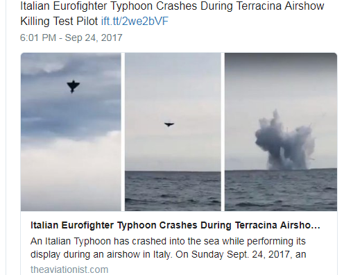 Yes, I've seen some speculation on Both those scenarios today, . . one comparing it loosely with the Hawker Hunter accident at Shoreham Air show a couple of years ago, top of the loop too low, insufficient height to recover, even though the Hunter pilot 'Nearly' made it and walked away. . .Eleven innocent motorists didn't though. This Typhoon was being flown by a test pilot, who ought to have been fully aware of his own physical tolerance for 'G'. . . Also, I would have thought that an aircraft full of 'Intelligent' electronics might have prevented such an occurrence ?. . . I expect that it will be a while before investigators discover the cause, but being a front line military aircraft, it's doubtful that they would release information which could highlight any weakness of the design for the benefit of competitors or 'The Enemy'. . .. . . 'Pilot Error' would be the easy get out clause in that event perhaps. . .