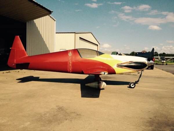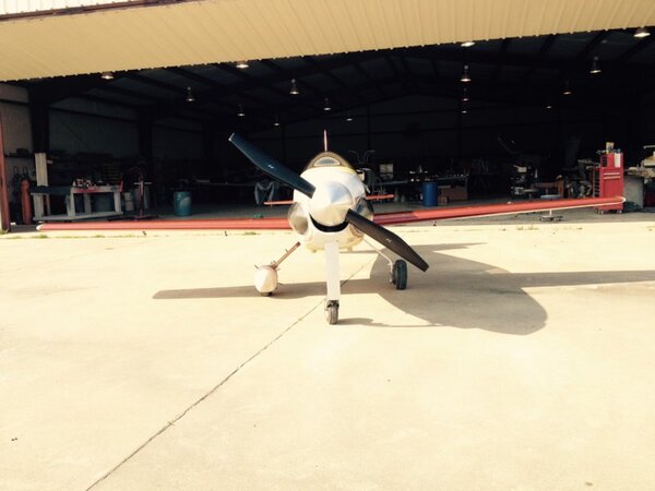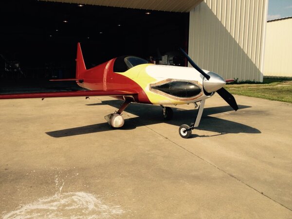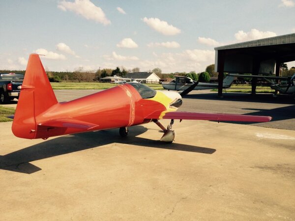 It had its first high speed taxi run today. Lanny reported extremely good acceleration to around 70mph with the acceleration getting better as speed built up. The Rotax was only turning around 3700 rpm at 70mph so still way down on the "power band" for the engine. In spite of the low power being delivered, acceleration was still exceptional. Calculated best climb speed is estimated to be around 120 knots where the engine should be turning at around 4800 rpm so turning 3700 rpm at around 60 knots would be about right to achieve the anticipated 4800rpm/120knot climb parameters. Here are a few pics of the Bug after it was dragged out of the hangar for the taxi trials. It's been washed so it looks better, but tidying the paint job will have it looking downright fantastic! -