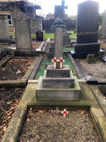 A photo just sent to me today from Newcastle, England of Alec Wald’s grave, taken on Armistice day this year. He still has folks paying their respects each year. The local primary school has for the last few years had their junior primary classes visit his grave where the teacher tells his story. The children then have a project to either draft a poem or draw a picture about some aspect of his story. I have been sent some very nice photos/poems by the school. The favourite drawing is of his aircraft flying under the Tyne Bridge in Newcastle which he did in July 1918. There is also a display in a local hall about him each Rememberance Day and he has quite a following in the local area. My family appreciates the interest of the locals in a boy that is buried such a long way from home. -