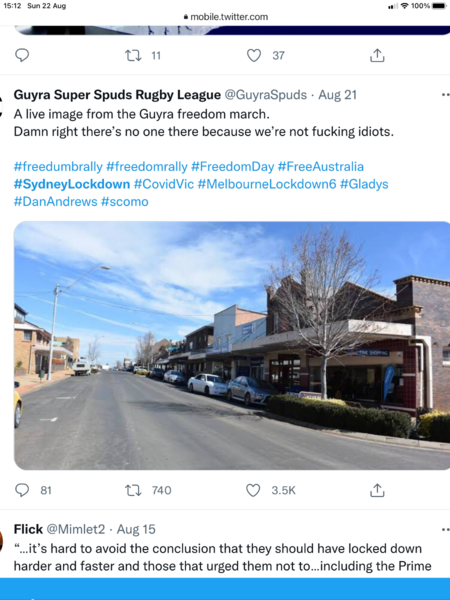 Here is a screen shot of the ‘freedom March’ in Guyra NSW. Seems appropriate. We need to be very cautious about civil unrest, particularly when it is formented, in part, by government ministers’ whistling to neo-fascists. There is growing concern in senior constitutional lawyers that our current federal government are consistently testing the limits of Executive power, and this is particularly in relation of using the military for domestic civil issues. My understanding is that currently the military can only be sent in on the request of a State govt and the military must be under the direction of State officials (ie. not their usual chain of command)....but this is a practice untested in courts. We even had the recent spectacle of Morrison having the Cth side with that Qld nutter Clive Palmer in the High Court to overturn WA emergency border controls. Of-course, there is also the increasing practice of putting uniformed military throughout the federal public service.