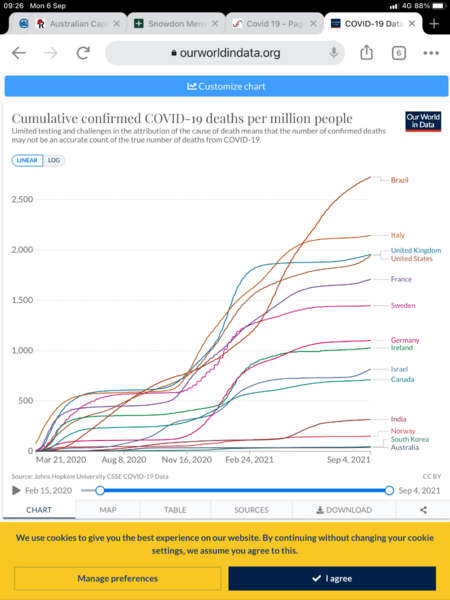 Pretty bad actually. Around 1500 dead per million of population so far. Compared to neighbouring Norway of 150 dead per million. But still less than basket case countries that allowed cross-border movement of people etc, like the USA (1,800), UK (1,900), France (1,700), and, of-course, Brazil (2,700). Keep in mind Sweden did pretty well considering they had a government MIA mainly because their population is well educated and despite not having lockdown rules, the vast majority actually headed advice to avoid contact with other people. Swedish friends tell us that many Swedes took off to their summer houses. Compared to countries that actually did lockdown with high exposure (ie. not remote like NZ and Australia), look to South Korea (42 deaths per million) and Taiwan. Below is a nifty graph of cumulative Covid deaths per million of population. The Doherty people are pretty smart. But keep in mind there are trade-offs. Yes, a vaccination rate of 80% will bring ongoing daily deaths down substantially, but it is a value judgement, not science, as to what level of deaths is acceptable. For example, the UK now has over 70% of tge population fully vaccinated (over 90% if you include ‘natural immunity’ ) and they appear to find 1.34 daily deaths per million (around 100 deaths per day) acceptable. This applied to Australia would be over 30 daily Covid deaths on an ongoing basis. So when people say we would be ‘living with tge disease’ like the flu, you need to keep in mind the flu kills around 3000 Australians per year....my estimate is that Covid would kill 3 or 4 times that number.....so it is not ‘just like the flu’. If you are a follower of eugenics and involuntary euthanasia, then I suppose the over 10,000 expected deaths per annum we would get from ‘let’s all get vaccinated and let Covid rip’, would be good because the greatest number of deaths will be the aged (not in the labour market) and tge vulnerable, and they are just burden to the economy’.