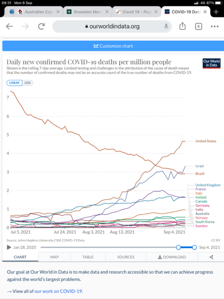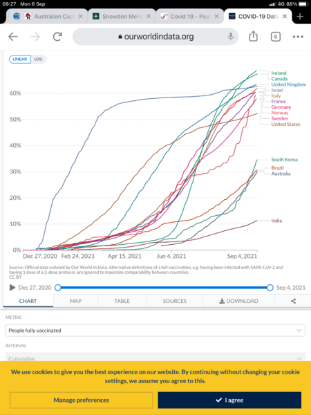 Here is some data....might help when comparing proposed policies for Australia like get population vaccinated and let it rip, or as ScuMo said in Parliament last week, ‘yes, people may die but you can go to their funeral and to church’. UK daily death rate is now tracking around 1.6 deaths per million per day and many of these deaths are of vaccinated people (last I read on this it was just over 50% vaccinated). And this is after they have had Covid kill the most vulnerable. That means if we follow this approach....vaccinate, ‘freedoms’ and open up borders sans quarantine etc we can expect 40 deaths per day or around 15,000 deaths per year. This is still roughly in accord to my previous ‘back of the envelope’ estimate and is consistent or less than estimates of some expert epidemiologists. It is of-course much more than annual flu deaths, road deaths, or estimates by experts like Doherty which were based on low incidence of infection with ongoing TTIQ (track, trace, isolate, quarantine) and lockdowns. Second graph is vaccination rates. I haven’t included a graph of daily infections...but that graph does show infection rates doing the usual up and down waves, including in vaccinated populations. The big difference in vaccinated populations is that the death rates and hospitalisations are greatly reduced, but death rates and hospitalisations remain significant nevertheless. I agree fully with previous comments about us having to change our behaviour, like fly-ins to private airstrips, avoiding mass transportation (trains, large passenger planes, quarantine and negative Covid tests for international travel...as many European countries now do) ongoing into the future....ie. no back to the way it used to be. Covid with climate change is making it all very depressing....it feels very much like Neville Shute’s ‘On the beach’, with us here in Oz just waiting for the inevitable environmental disaster to roll on down from the north. And we also appear saddled with a completely incompetent government which is becoming less democratic by the second. I feel for my children and grandchildren.