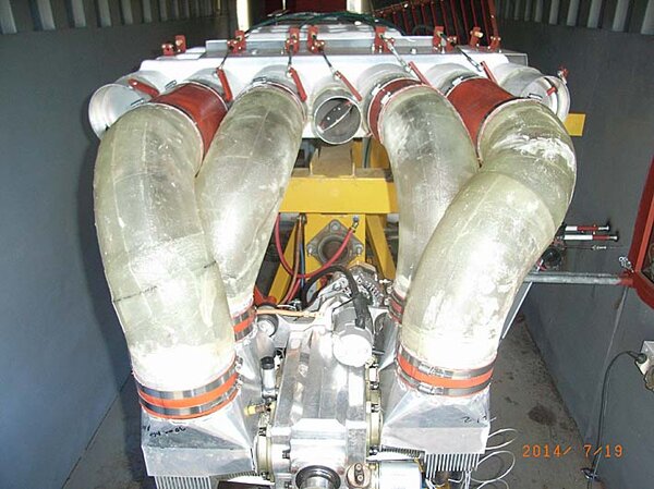 Seb: Personally, I'd say that ALL of your cht's are quite decent: you are within about 4% spread (unless my maths is as bad as it often is..) Remember: the 1-3 side cylinders are forward of the 2-4 cylinders, so the 'ramp' effect for the intakes is quite a bit different. Cooling air just does NOT behave as one wants; it's a capricious bastard. I hope that one day, CAMit will reveal what its research has shown to be the problems with Jab engine cooling. To get balanced, controlled air delivery to each individual head, this is what your need ( my engine in that image): The small unused central outlet is for the oil cooler air supply; the two blanked off outer outlets are there for testing six-cylinder engines. As you can see, each cylinder air supply has a butterfly to allow balancing of the airflow to that head. The whole assembly is fed by a 6KW or so electric motor driving a squirrel-fan assembly about 25% the size of a Volkswagen Beetle (original version)!