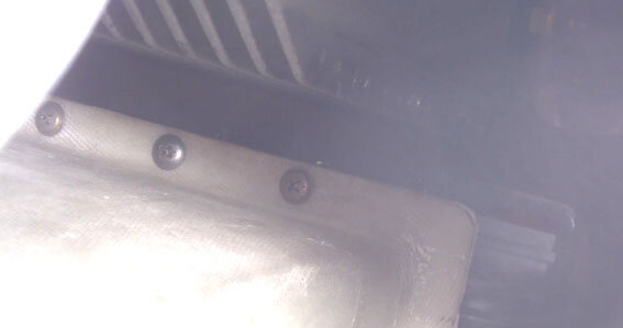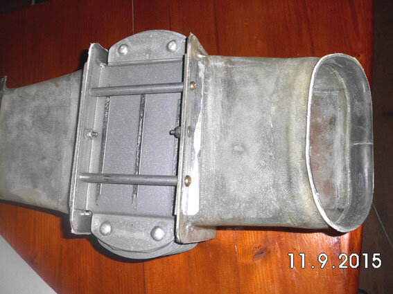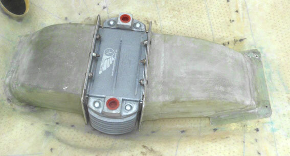 4. Well, the lower 'nostrils' have been reduced to two 2.25" round inlets to feed the barrel plenum - not 'howl cowl' intake style but I suppose some will think it's a bit that way! Yes, the expanding and contracting shape of the oil cooler ducts are for pressure recovery; I got the dimensions from Dafydd, but basically, I THINK it's an included angle from the cooler forwards and backwards of no more than about 12.5 degrees i.e. 6.25 degrees on every face. I had two objectives for that arrangement: firstly to get the cooler exhaust out of the low-pressure area of the cowl (obviously), but secondarily to mount the cooler not OFF the engine /mounts so the oil isn't being shaken and possibly frothed. So that duct is a self-supporting structure for the cooler (there are a pair of tubes bolted across the bottom of the cooler so its weight doesn't bend the cooler flanges: The 'nose' at the intake was moulded to fit the intake lip and seals with some bicycle inner-tube - which being already curved, fits beautifully!. The front simply plugs over the inlet. At the rear, two nut-plates allow the cooler to be detached and dropped off the bottom cowl so it can hang off its delivery tubes when the bottom cowl is removed for maintenance - a three-minute job to detach/replace. I have installed a CAMIT TOCA to keep the oil temp where it should be without excessive warm-up time. The whole thing is a tight fit under the engine but with enough room ( I HOPE!) to allow engine rocking without touching: