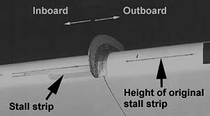 I can't guarantee this will work on any aeroplane - however it did work a treat on the two that I have been able to try so far. I'm talking here in the context of somebody developing their experimental homebuilt: First, remove the VGs on the wing from the wing root, to just past the same spanwise station as the tailplane tips. Leave them on the wing, outboard of that point. Next, fit small leading-edge "fences" to the wing leading edge, in line with the tailplane tips - i.e. a couple of inches inboard of the first VG. See photo. The fence need only go to about 20% of the wing chord, on the top surface, and it need only be around 60 mm high. It can probably be stuck on with double-sided tape, for the initial test. Then: Fit small stall-strips on the INBOARD side of the fence, as shown in the photo. Make sure you put them at the same height on each wing. The stall strips need to be about the size of a piece of triangular file, about 8mm wide on each side, and about 50 mm long. Butt the outer ends of them hard against the side of the fence. Now, load your aircraft about 3/4 of the way to its most aft CG limit, go to a safe height (at least 3000 ft AGL) and try a gentle power-off stall, keeping the ball in the middle. If you get a wing-drop, go home and raise the location of the stall strips by 3 mm, and try again; repeat until you do not get a wing drop. If you do NOT get a wing-drop, go home and lower the location of the stall strips until you do get a drop, then raise them one increment. Do NOT allow the aircraft to start an incipient spin; if the fence comes off on one side, it could get exciting. Once you have found the correct location for the stall strips, progressively move the CG aft to the rear limit. If you get a wing drop in a straight power-off stall, raise the stall strips another increment, and try again. Once you have the stall strips located in this way, you can put them on for keeps. What this does, is to cause the central part of the wing - the bit between the fences - to stall just before the outer part, where the VGs are. That does three things: Firstly, it creates a pair of powerful trailing vortices that turn the opposite way to the wingtip vortices. These vortices in effect magnify the effect of the fences so that the stall cannot spread outboard past the fence. The vortices are not there until the inboard part of the wing stalls, so there is no additional drag in normal flight. Secondly, it reduces the wing downwash on the tailplane - which prevents the elevator from being able to pull the aeroplane any further into the stall. Thirdly, it produces a strong "centring" effect on the vertical tail, which acts to prevent the aircraft from yawing. Whether these effects will be sufficiently strong to overcome the effect of full power or full crossed controls, will vary from one aircraft to another. You just have to suck it and see. If the setup works on your aircraft as well as it did on the Seeker and the Aeronca Champ, your aircraft will now be extremely reluctant to enter a spin. However, that is no guarantee that, if you do manage to get it into one, it will be recoverable. This is REAL test-pilot stuff, i.e. hazardous. Spin testing is a separate issue. -