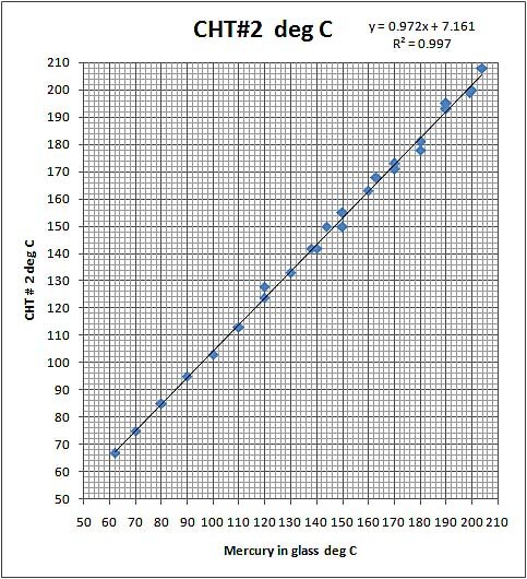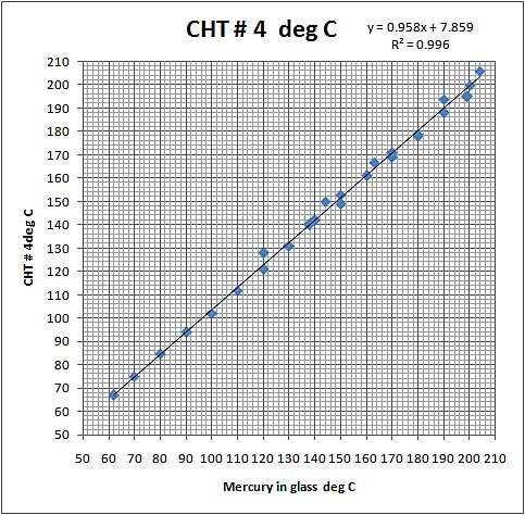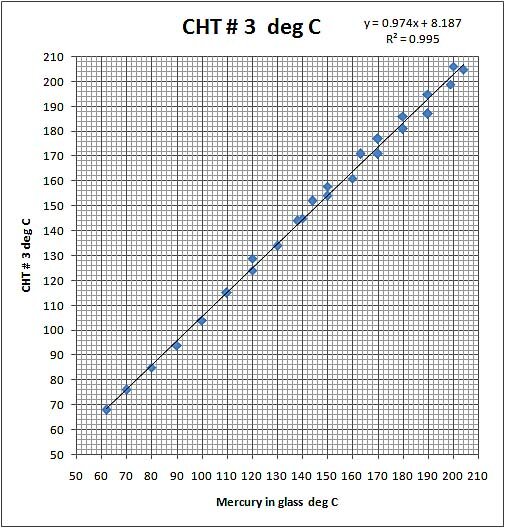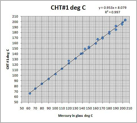 For what it may be worth, here are the results of four CHT calibrations, for K-type thermocouples supplied by Ian Bent, as read by MGL Infinity E-3 gauges, at the end of approximately 3 metre K-type extension leads. The thermocouples had simple crimp-type electrical (plated copper) eyelets which were fastened to the calibration block by 8-32 steel screws. The calibration block was earthed to the system ground, as were the "ground" leads of the E-3 gauges. The E - 3 gauges have cold-junction compensation; the cold junctions were located close to the gauges, i.e. at essentially the same temperature. As you can see, the accuracy was quite good. The graphs are an amalgam of rising and falling temperature data.