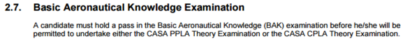 11. just read this in the casa website, A pass in BAK, either BAK(A) or BAK(H), is no longer a pre-requisite for a candidate to sit their PPL or CPL theory exams. However, a pass in BAK of the relevant category, must be obtained prior to either a PPL or CPL flight test. Introduction to new pilot licensing regulations | Civil Aviation Safety Authority So does this mean even if i do ground school prior to flight training and pass my ppl exam i need to subsequently sit the bak exam before i can have my ppl flight test? Is the rpl exam equivalant to the bak exam or is this different and you still have to sit the flight schools bak exam even if i do the rpl exam? confused again......