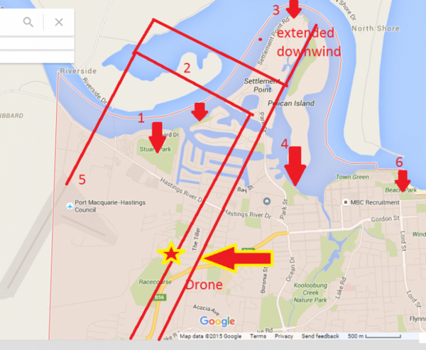 16. When PIC - Ive only seen two different drones...but only one in the actual circuit area ...and I saw it twice on the one day ... see star on the pic Riding and walking around town though i see them all the time...I run and ride a lot along the river walk and parks and they are often flying them and model AC (illegally) in the local parks...the days of people flying these at the designated RC aero club seem to be long gone... Im not up on the current regs for RC airplanes. I would generally see 2 to 3 quadcopters per week when walking, running, riding around town... these ones are in close to the township and not far from the circuit, see map below Most are only about 200-300 feet high at the highest. But occasionally I will see an operator with the tripod type video display where they place the cover over thier head, and those guys seem to go pretty high... id be guessing but id say they are around the 400-500ft mark In the image below they are most often flown at 4 , but at on average around once a month i see them at 1 or 2 (at arrow) or 3 or 6 2 (at arrow) is a real concern as its right on early base.... or glide approaches, 3 is right in the middle of extended downwind Our big saving grace is that generally as the tourist season hots up the wind is NE so we use the other other side ...makes it a non event. However these holidays its been blowing SW most of it including today and I saw two flying this morning at location 4 on my walk... I have not seen any at number 5 which is an open playing field immediately prior to the threshold. Its only a matter of time and some well meaning, but poor thinking dad will rock down there with the kids on holidays and their new drone, throw it in the air and then realise oh poo as an aircraft plows through it on late final. The main concern is the student pilots doing precautionary S &R at 500 ft as they come past locations 1 & 2 , or on glide approaches some tend to cut the corner past location 1 and 2 [ATTACH]24861[/ATTACH]