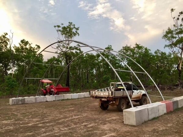 5. Just a little update on this. As I mentioned a while back in a discussion about hangars, we are throwing up an arched shade structure for ours. In addition to the basic fabric roof cover we will put up a steel rear wall and a lockable gate on the front. In case anybody’s wondering, putting up one of these with just two people and a dog beyond the black stump and in blistering temperatures is a bit of a struggle. Next project will be a little avgas depot with hand pump. Alan