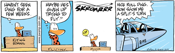 The new Ding Duck Book, "I Want to Fly" $18.50 is due for release in Australia December 1. It's a compact A5 size with 160 pages in full colour featuring Ding and some of his favourite characters from the Swamp including the Air Traffic Controller and Flying Instructor.