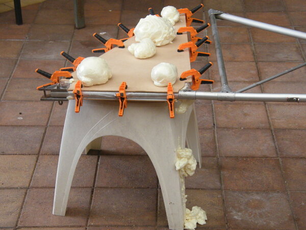 Spray foam expands about X3 and needs to be confined so I purchased some white board and a load of clamps. Now, in order that the foam didn't stick to the board, I first wrapped the frame in Clingfilm and then clamped on the front and back boards, the front one having access holes. I burnt matching holes through the film with a pointed soldering iron.