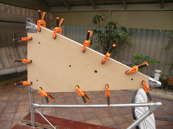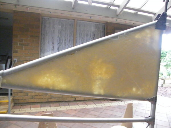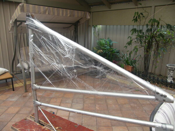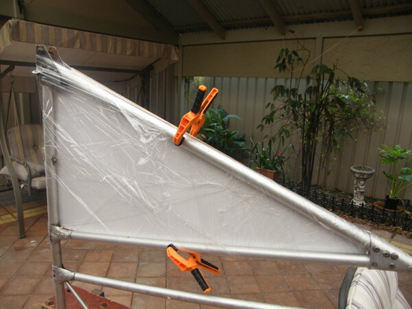 This final image is after I had reworked the foam some what. The main problem was that the boards, clamps and stiffening batons clamped across the fin fill, did not prevent the boards bowing outwards and thus ending up thicker than the tube by about 4 mm both sides. By taking to it with a fine cut saw, a small Surform rasp and glass paper, I took off all the high points. Filled some voids and then taped over the tubes so that the resin doesn't stick to the tubes. You never know if this lot has to be removed at some future time. BTW, Instead of c/film on the fin, I just sprayed my boards with cooking oil. Worked well and didn't effect the foam at all.