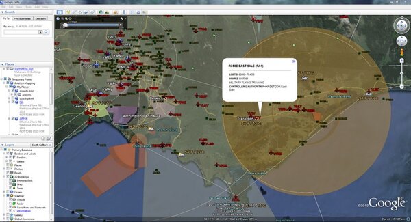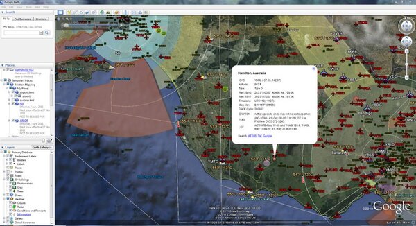 Ok.. Google earth is a free download but can only be accessed from the google site - No big drama. Add a *.kml download and (other small apps as required) in a zip file and away you go. Google earth will work with external serial or USB GPS's (must be mappable to a port). The paid version is available to non profits etc as a Grant. Has higher level map editing tools. A simlilar type system is used for the UAV's. The data as it stands is public domain (most of it came from a link on this site and I made a couple of personal changes). A fair amount of work is required to make it accuate and concise from an airfeild point of view.. Google being xml based makes editing the map / location data easy. I have the 2002 ERSA data loaded as a layer (public domain file with copyright) but it is missing the radio etc.. Map styling can be changed (with an additional hidden download from google) to support the Bing maps, Google Terrain (fav - 3d), Hybred or heaven forbid Open Street maps. Google maps are the most accurate and are out by no more than 70m at the edge of the map tiles (those squares that download as you pass over them). This can be calibrated if you want to get really technical. There are ways of storing larger caches of maps using open source map download tools than the standard 2gb that google impose. Total database size is <4mb.. Map cache is max 2gb on standard maximum settings. (try not to store maps on SD cards as they don't like lots of small files.) If required I have access to some pretty sharp Web / Java Devolopers that will give me some time with the correct bribes of fresh seafood from work. Method I have been using for flight planning.. KNAV and export track to Google Earth. Load google earth check flight paths, weather etc.. Load flight sim and prefly route if required. Go fly (with a spare GPS lol). Knav seems to be a dead project - shame it had potential and is a great tool. mmm source code is on their website, Anyone! Oh you can also display a unlimted number of additional live tracks from other users by simpy loading a KML file into google that is directed to a file server (google host at present) that is collating the data from the other users.. (3G based ADSB or maybe a battlefield control system for the next game of Skirmish, for nix anyone!) Data can be collected from google map phone users as well- A GPS phone not required as it will give you a general location of the user with an area of accuracy normally within 2-3nm. At least you would know if someone was in the area. It would be an interesting experiment to do at the next NATFLY, Get as many pilots to fire up Google maps with Latitude as they take off and track them in. Hardware cost - $246 for a Acer Netbook with 250gb Hard drive, 1Gb ram and Atom N555 1.6 ghz processor. 10.1" screen. Anti glare protective screen cover ($10), Onboard Intel graphics can handle very basic 3d and seems to work fairly well. Battery life on Average 5hrs but has a 12V power supply. At present I am using a Garmin 72 with a serial cable for the GPS. GPS USB mice are around the $35 mark on Ebay. Add a wireless compatable mobile phone to the mix for the live weather etc (and to act as a spare GPS..) as part of the normal cap. Ian - would it be possible to somehow convert the old html airfield map into a online wiki so others are able to add information about the strips. It would require some form of standard, with a form of cross checking the validity of the data. Lat, Long and all the fun ERSA type stuff with a local knowledge section. Oh and maybe a link to the TAF etc for that airfeild.. Downloadable weather directly into google earth via the plain english converter! -