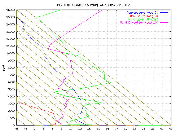 Guys, I would like to share some conditions experienced on Sun for comment by the more knowledgeable among us :-) & appreciate some comments on what you guys see as happening in relation to the Wx Balloon Data attached (wx balloon data is Perth Airport). Locations: 55nm East of Perth (Wheatbelt) Elevation 1000' Time: ~0600-0830 Local On the ground it was ~8kts 010/125 Noticeably cool from ground to ~1300' AGL and moderately turbulent with strong wind (I never checked the strength at that level). Between ~1300-1500AGL same but there were very small pockets and wafts of warm air mixing with the cool air. But still as turbulent. >1500'AGL a sudden transition to warm air and silky smooth flying. At 1500+ & all the way to 3500 (didn't test any higher) it was just hands off flying but with 15/20kts of wind still from the original direction. I'm with the whole inversion layer thing but would still love to hear any comments from other habitual wx analysers. The main thing I am looking to understand is why so much turbulence? It wasn't thermals as that hadn't kicked in and if it was wind why such turbulent wind and not more laminar flow? In general terrain around me was generally flat. Anyway, just throwing it out there for some discussion.