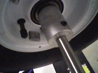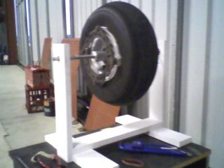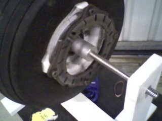 If anyone is having problems with main wheel shudder on takeoff ( and nose wheel shimmy on the t/o run ), I offer this home made solution to try... cost me about $50-60 to put together ( you need a lathe or a mate with one). If anyone is interested and motivated enough to make their own, PM for details. You can buy them commercially from a few m/cycle accessory importers but they range in price from about $250-400. Interestingly, it required about 50-60 grams to balance the mains with the discs attached. Best of all....it works!! Some images ( please excuse the poor quality, taken with phone camera).