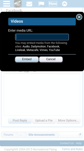 15. Thanks all for replies so far. Unfortunately I am interested in Facebook videos. Clicking on the media button (the film strip), it says we can embed videos from various sources....... I can do it with the BB code but figure I might as well ask if there must be other options? (maybe just making things more difficult)