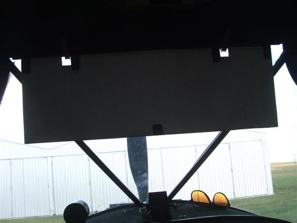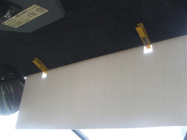 Finally here is the visor that I made for my Savannah. Works really well and I use it a lot. Simple construction, light weight and low cost. It's made of that material that's commonly used for real estate for sale signs. It's corrugated plastic, very light and quite rigid. Mine is 600mm wide by 200 deep. I can see out from under this to enough above the horizon for safety. A length of 6mm aluminium rod is epoxied to one edge. I added aluminium strips wrapped around and epoxied to give more strength. Cutouts allow the use of good quality plastic clothes pegs to use as hinges. The clothes pegs are riveted to the cabin top. They provide a friction hinge, and allow easy removal of the visor. When not in use the visor is held up to the overhead console by a tab of velcro. JG